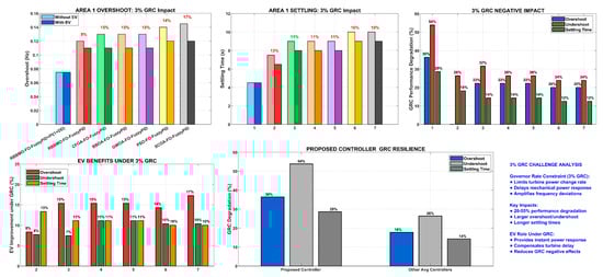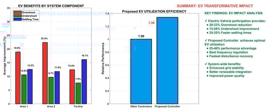 In the previous literature, studies have focused on enhancing MGs’ little-signal stability, transient resilience, and system-wide stability, demonstrating that MG efficiency may be improved by employing the best feasible design and security measures []. Consequently, there is a lot of interest in improving MG management systems, such as by merging RESs with ESS-controlled, including EVs []. According to surveys, electric vehicles are not effectively used for transport over ninety percent of the time. Throughout these periods, electric vehicle batteries can be used to fuel the MGs []. In order to increase system stability, effective load managing systems and adaptive protection resolutions must be developed because MGs are dynamic and operate under a variety of situations []. In complex interdependent large-scale linked power networks, LFC is critical for frequency regulation [,].