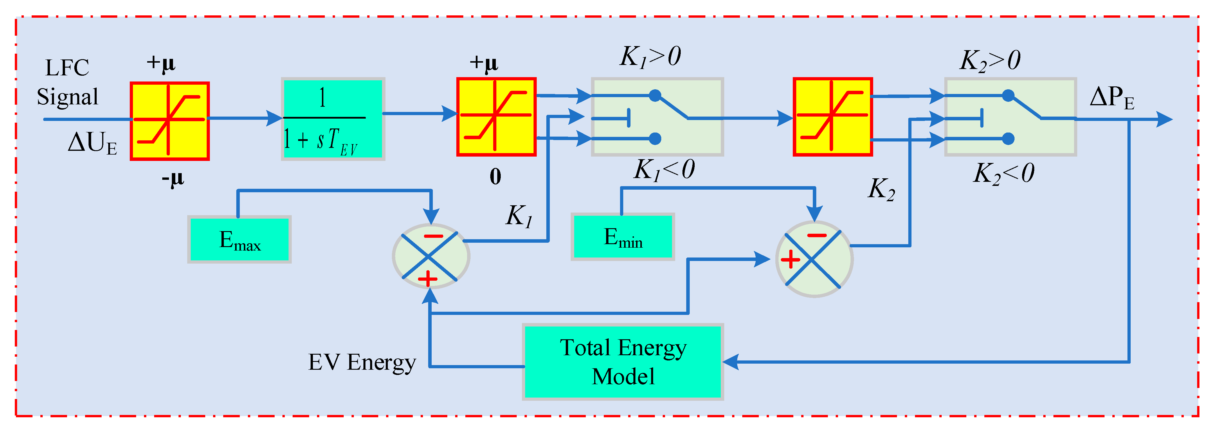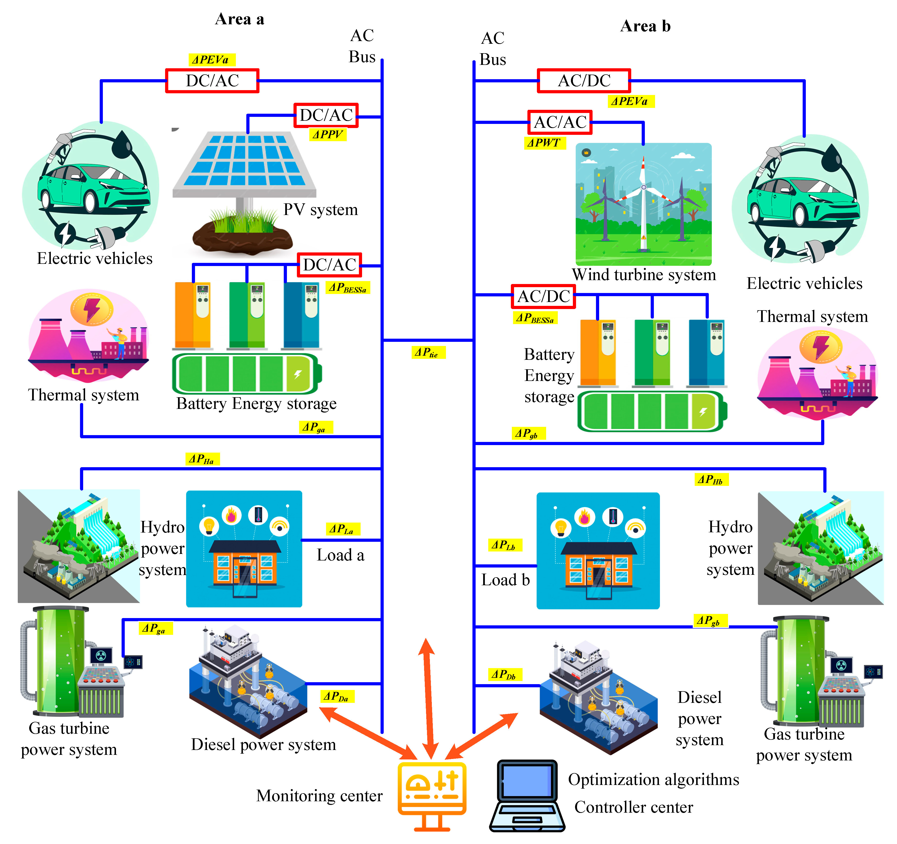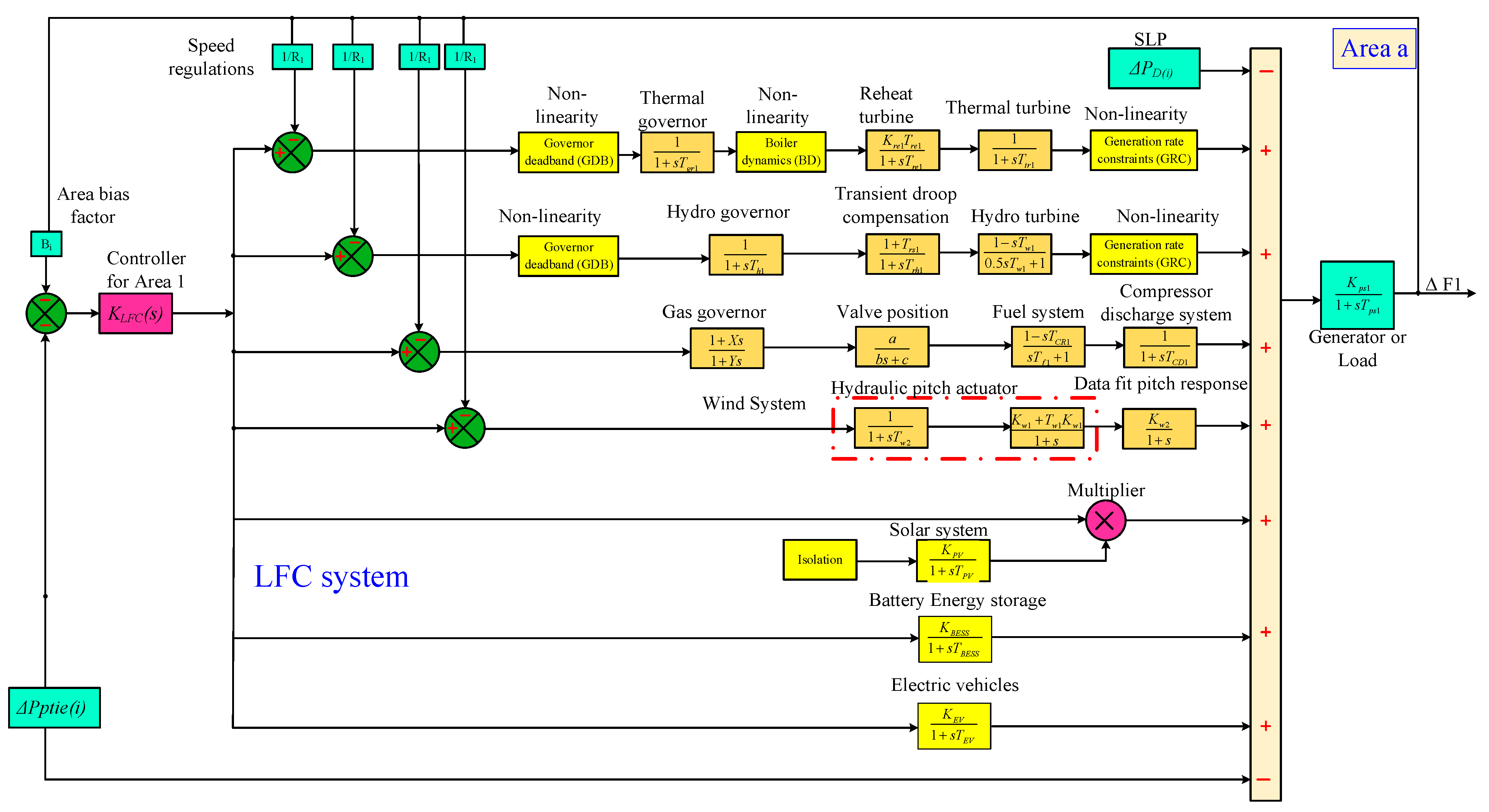 Detailed transfer function model of a multi-source LFC system integrating thermal, hydro, gas, wind, solar, battery storage, and electric vehicles to control power balance and frequency stability.