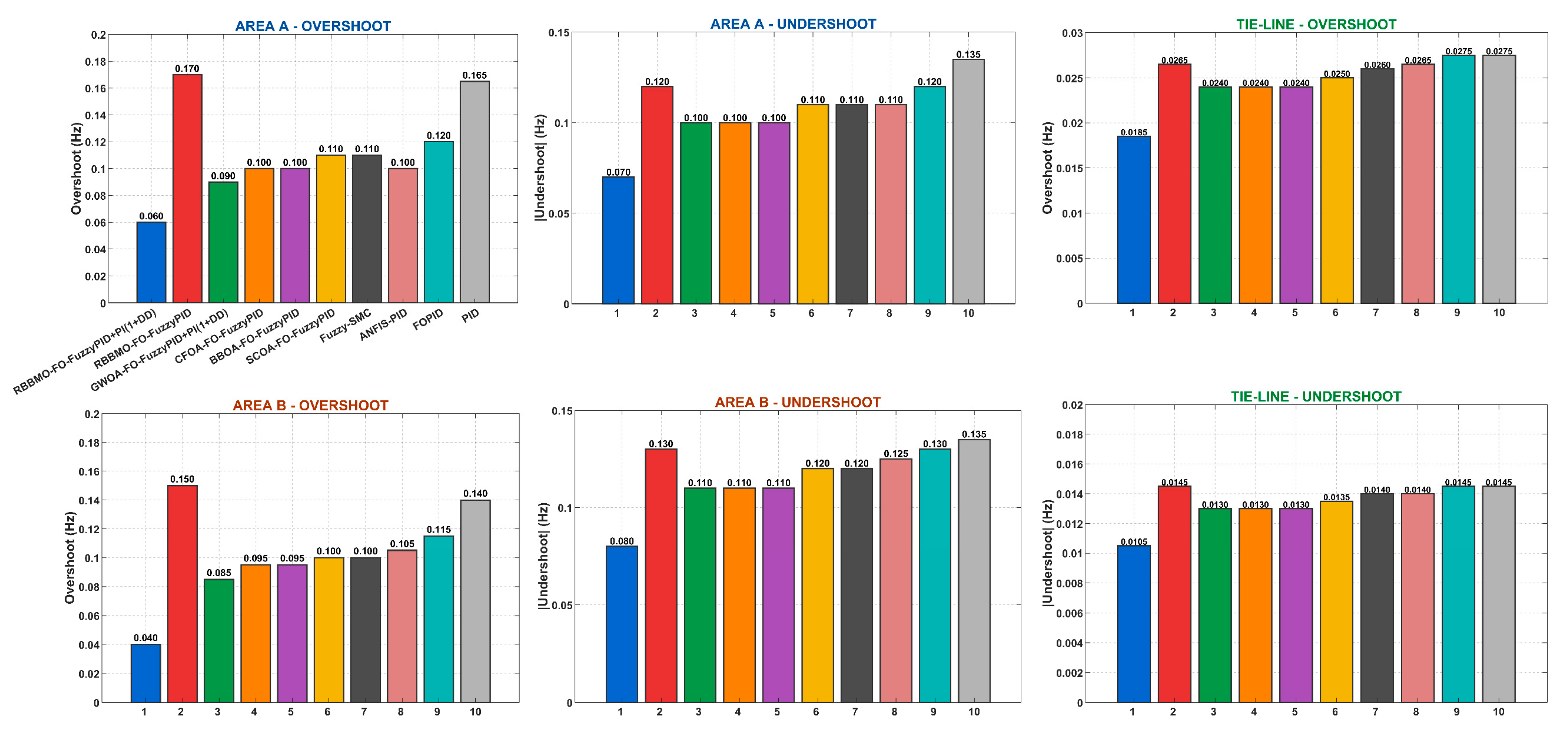 Comparative analysis of controller performance in overshoot and undershoot mitigation for Area-1, Area-2, and tie-line power.