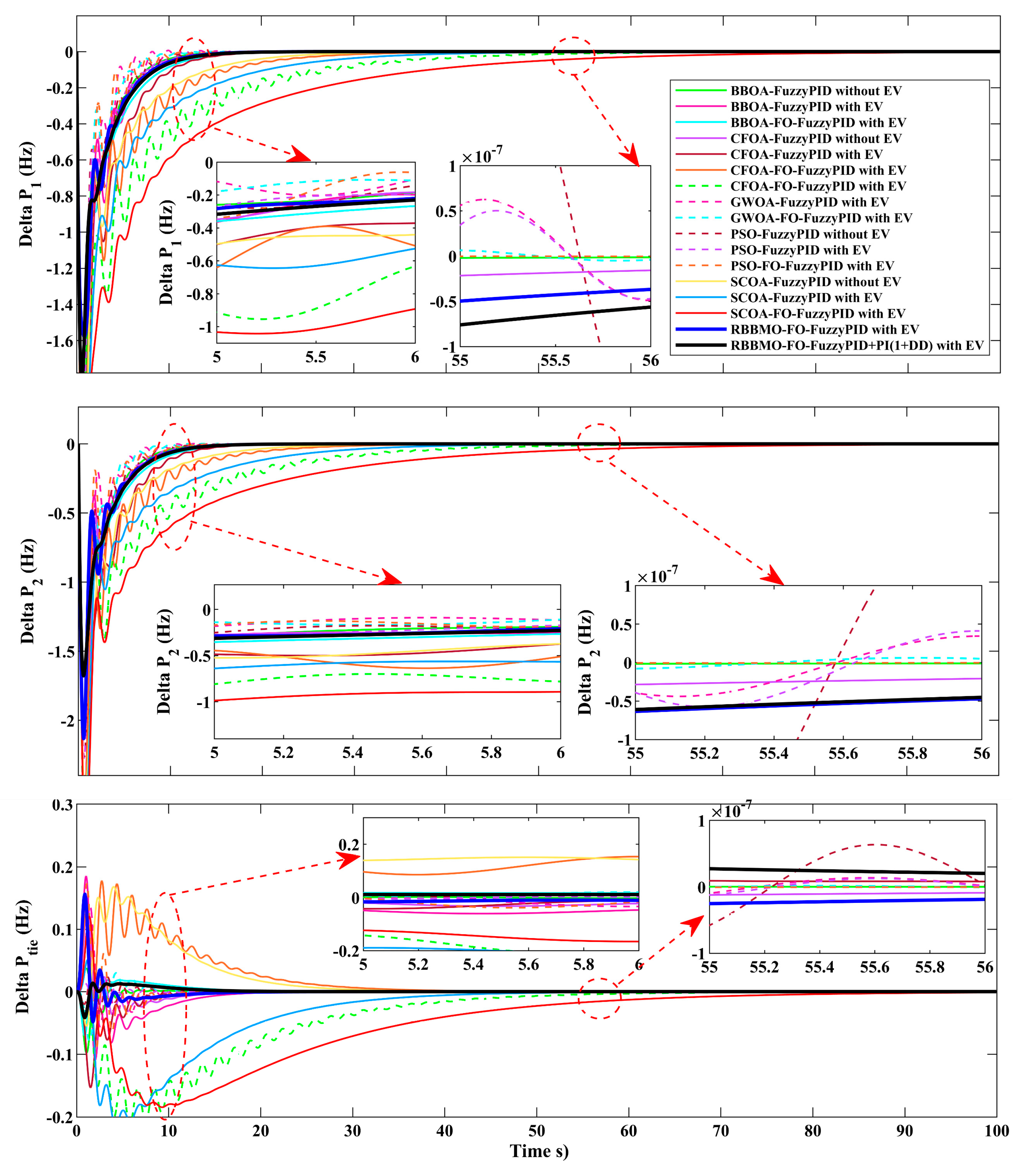 Time responses in the ideal, unconstrained case comparing controllers with EV and without EV: Area-1 frequency deviation Δf1, Area-2 frequency deviation Δf2, and tie-line power deviation ΔPtie.