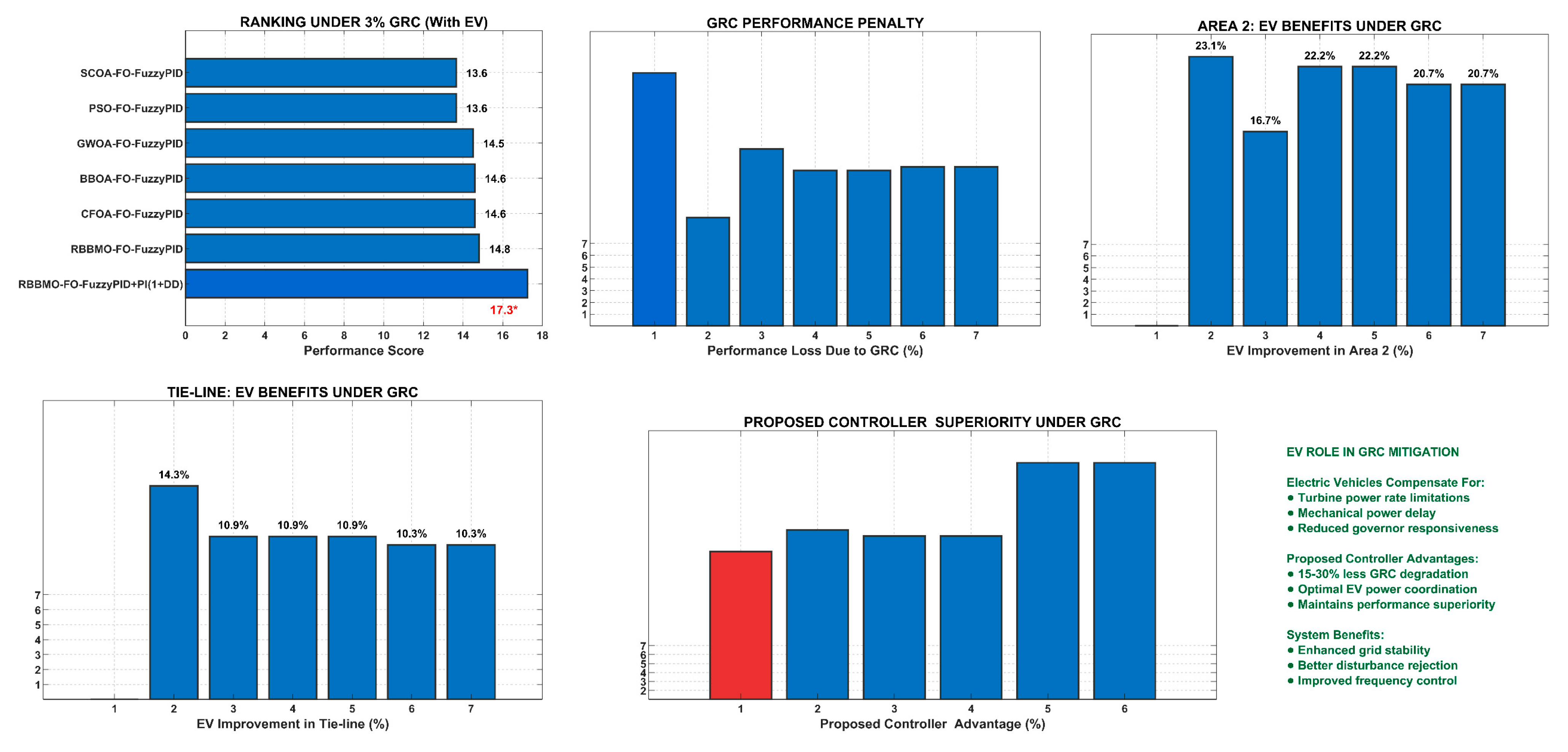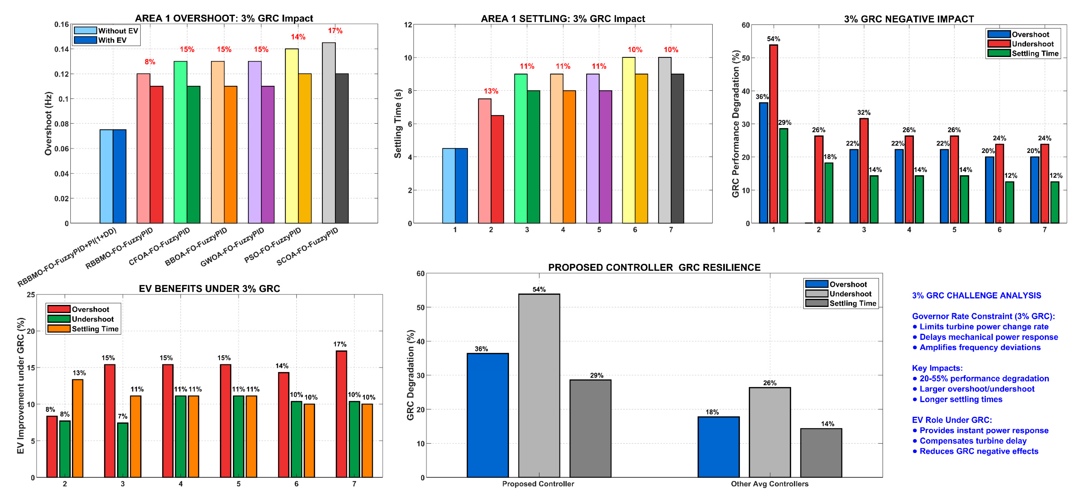 Multi-dimensional performance analysis under 3% governor rate constraint, showing controller ranking, GRC penalties, and electric vehicle benefits across different system components.