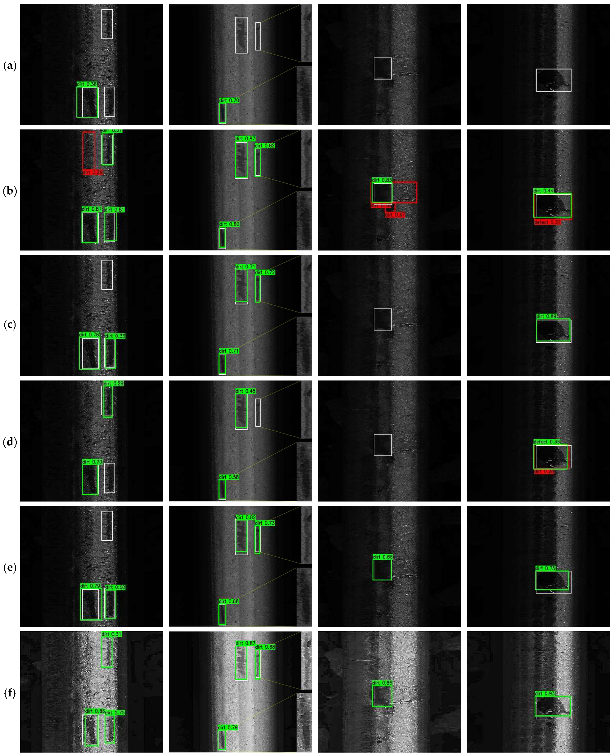 - Zhang, C.; Xu, D.; Zhang, L.; Deng, W. Rail surface defect detection based on image enhancement and improved YOLOX. Electronics 2023, 12, 2672. [Google Scholar] [CrossRef]