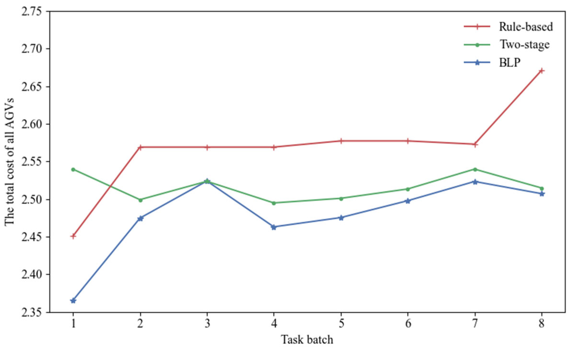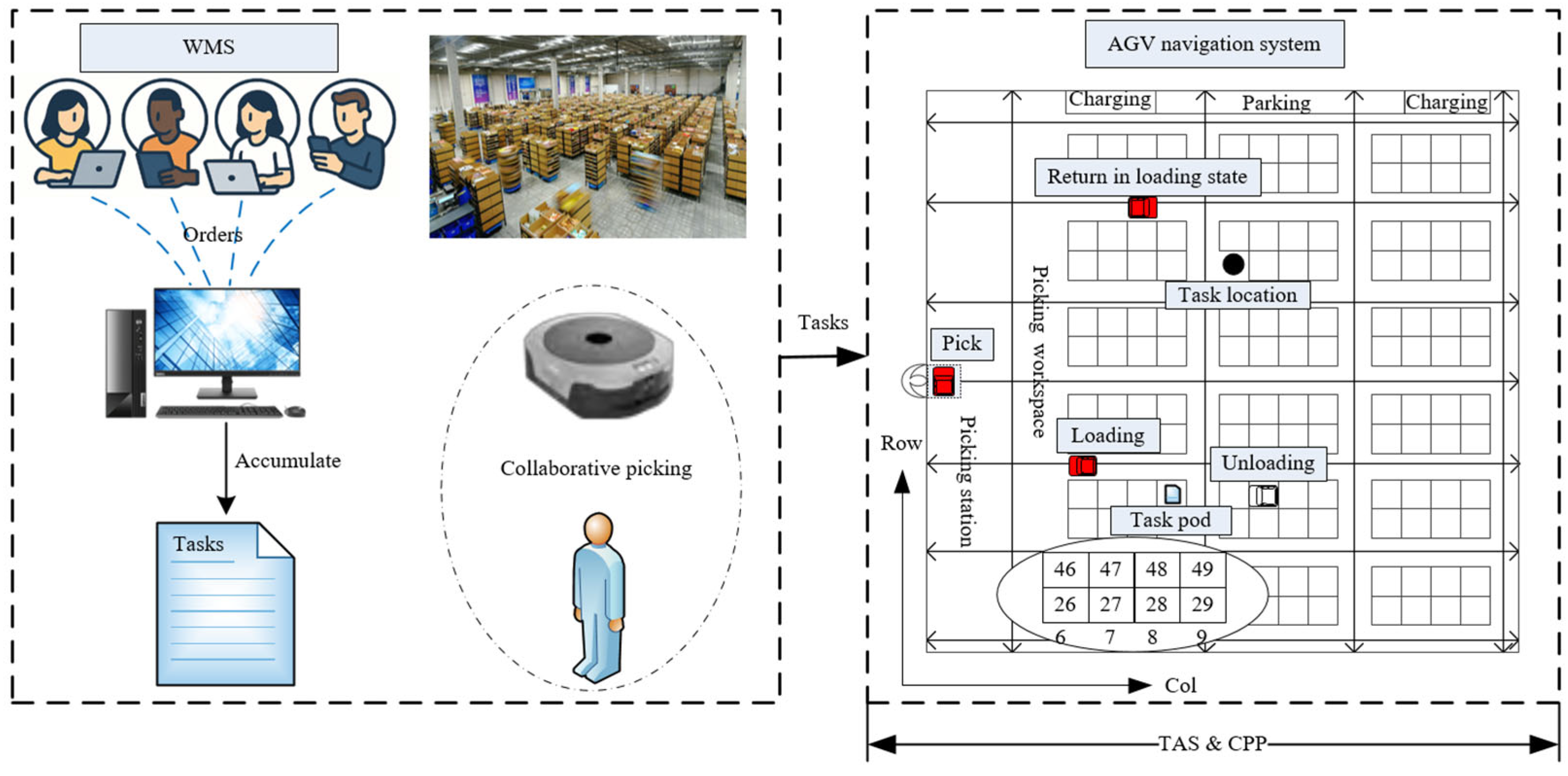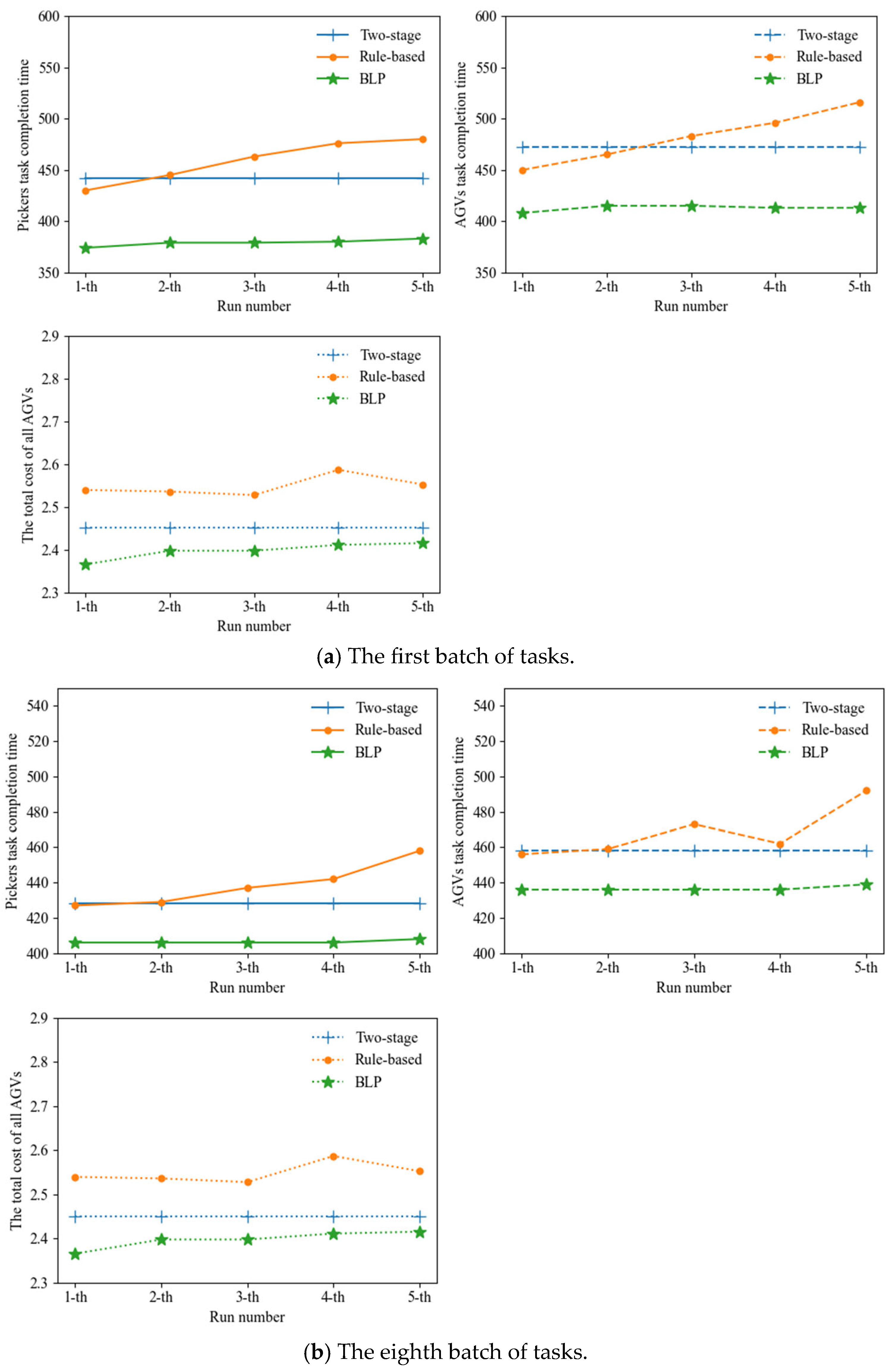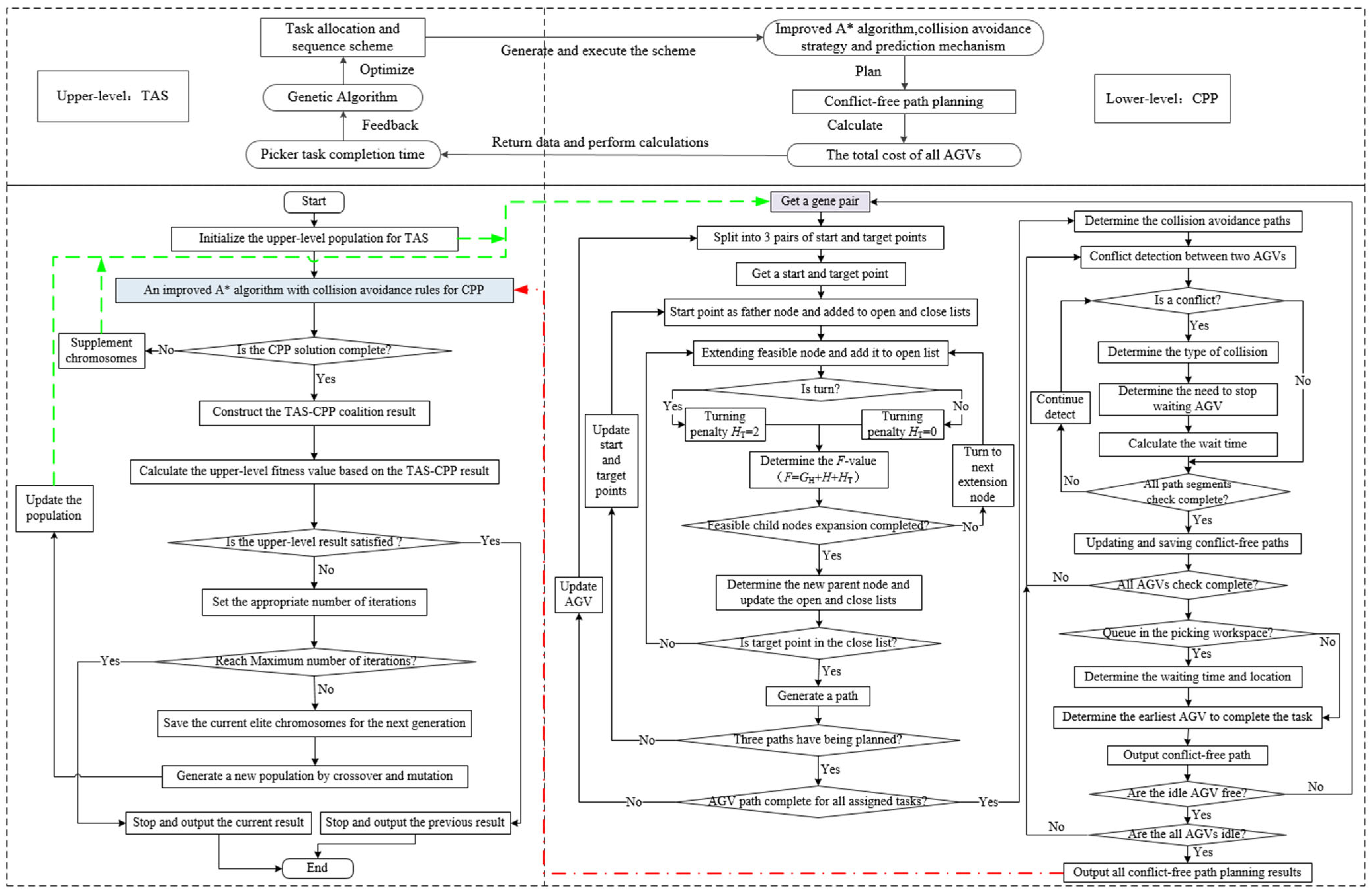 34]. After computing the path with the shortest distance and minimal turning cost, the algorithm generates CPP for all AGVs by considering collision avoidance and queuing conditions within the picking workspace. Based on the results of CPP, the total operational cost of all AGVs and the task completion times of the pickers are calculated. These performance metrics are then returned to the upper level, where GA evaluates the quality of the current TAS solution and updates it accordingly. This feedback-driven process continues iteratively until the upper-level objective converges to a satisfactory value or the maximum number of iterations is reached. Through this coordination mechanism, the algorithm effectively integrates TAS and CPP, thereby reducing overall system cost and enhancing operational efficiency.