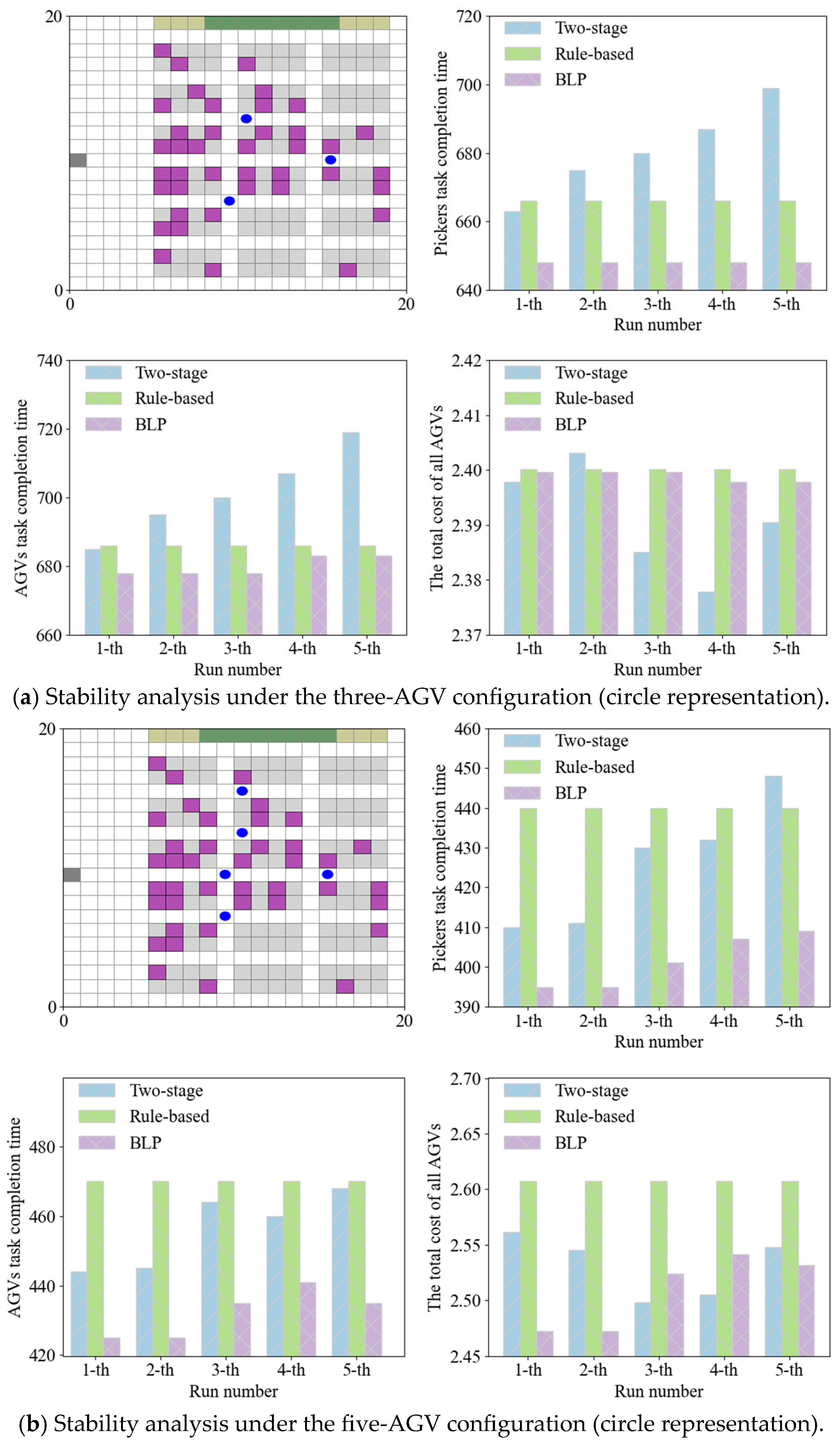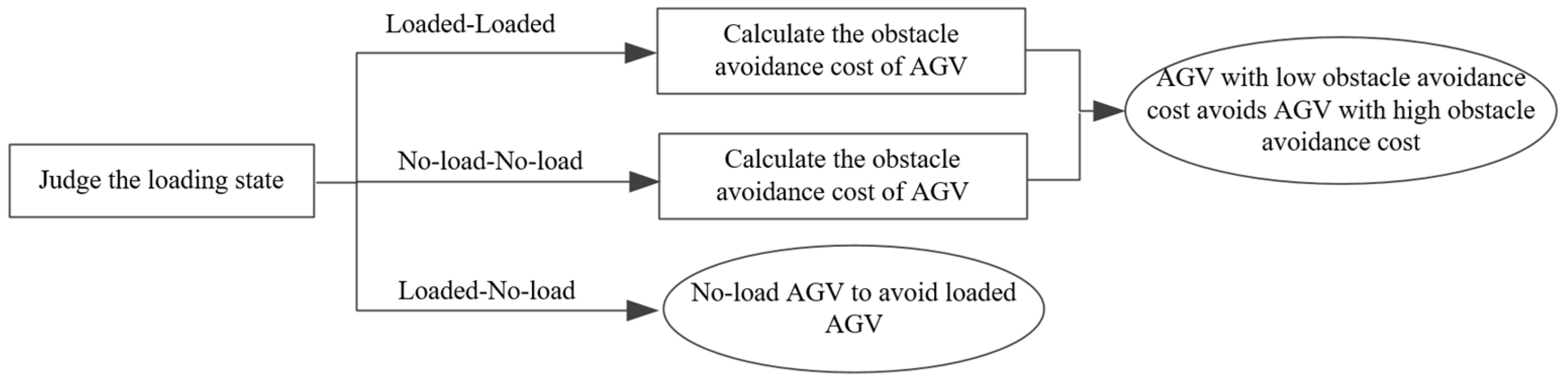 Figure 6, AGV priority is determined by two rules: (1) AGVs in the loaded state are prioritized over those in the no-load state due to their higher unit-time operating cost and task urgency; and (2) among AGVs in the same load state, those with higher obstacle avoidance cost are given higher priority.