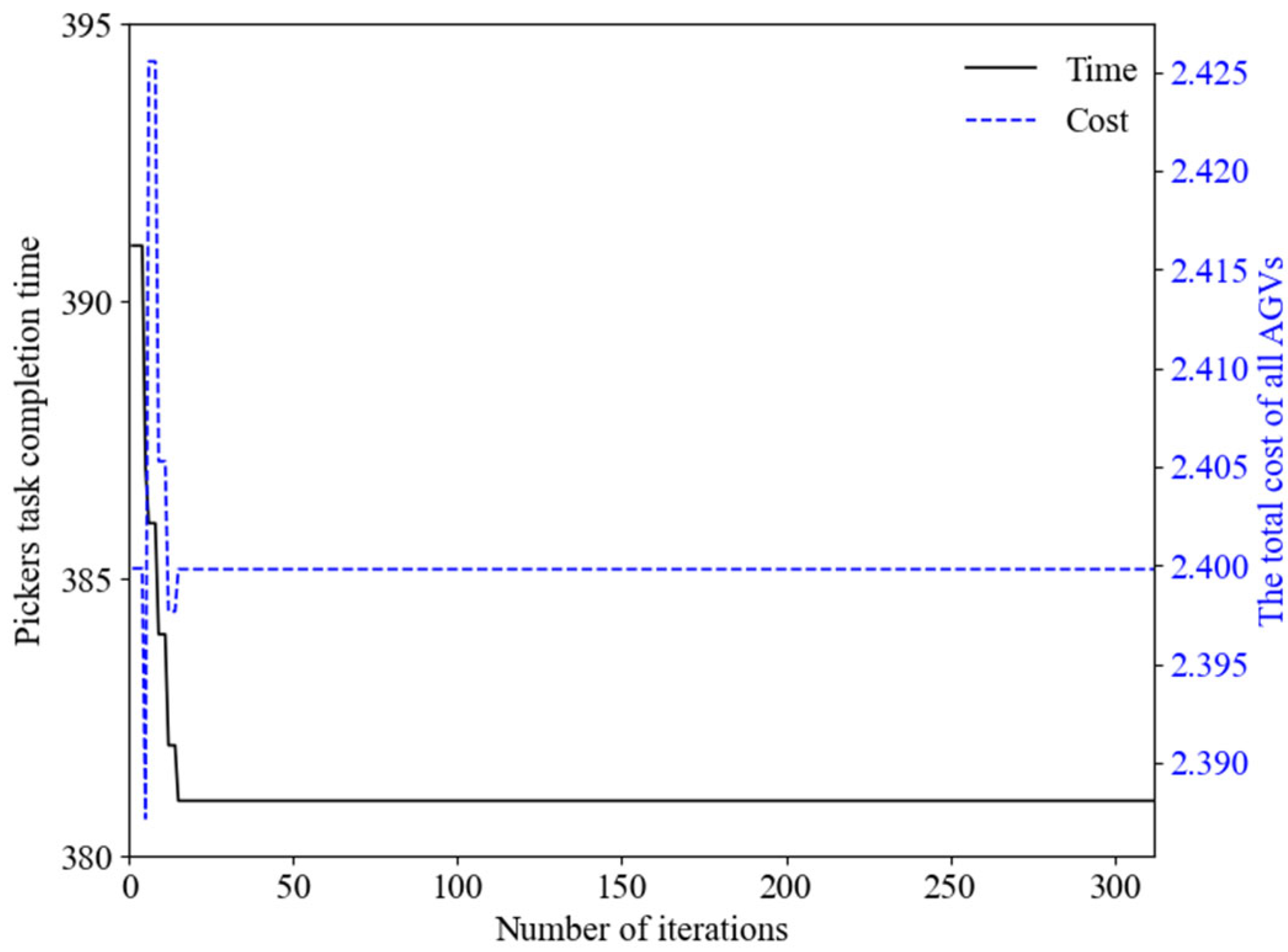 First, the CPP results are used to compute the pickers’ task completion time and the total cost of all AGVs for each individual in the population; based on this, the best individual is selected to advance to the next generation.