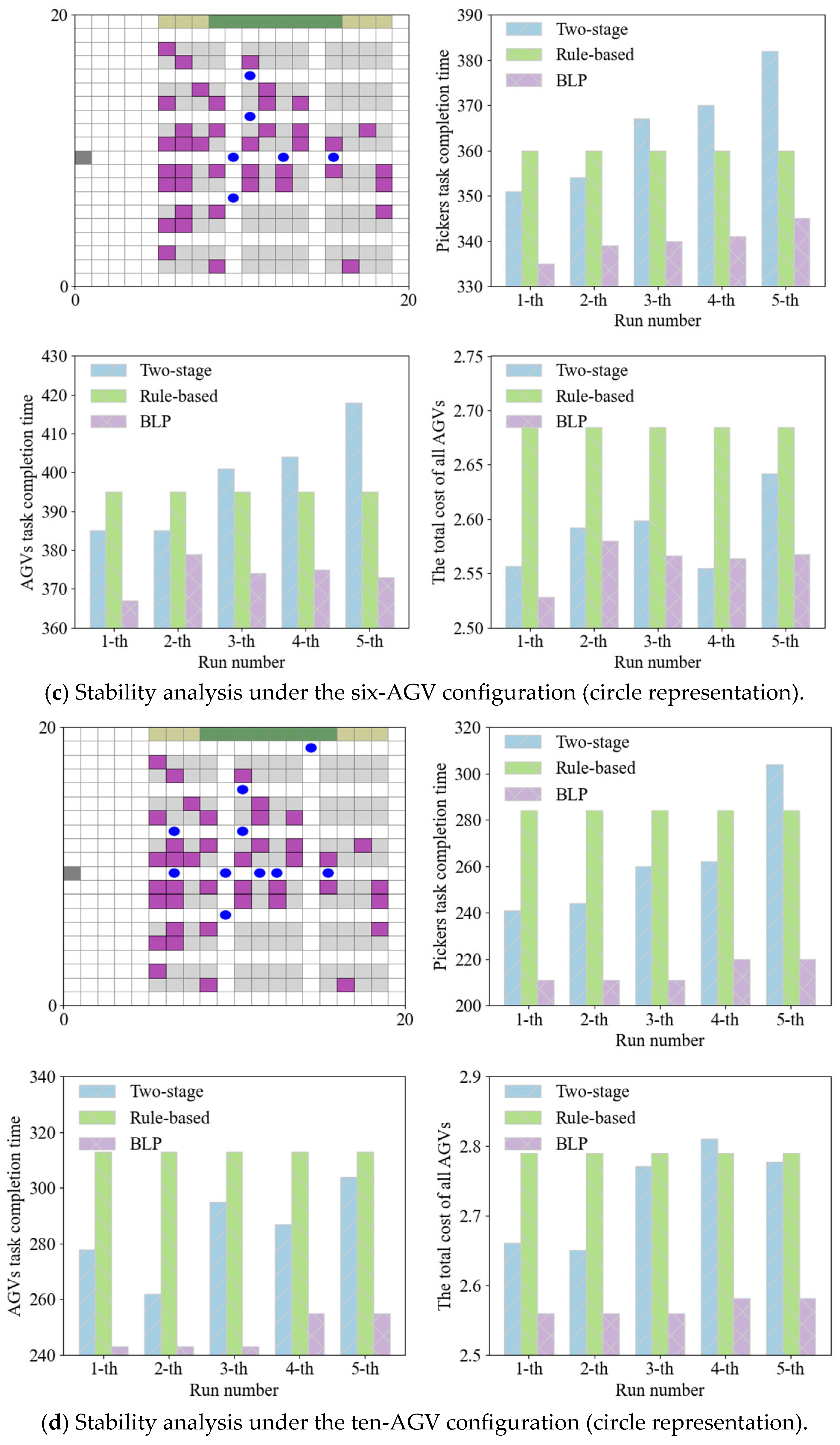 Fourth, the queue prediction mechanism is performed in the picking workspace. By calculating the entry time into the workspace and the departure time from the picking station for each AGV, the queuing condition and corresponding waiting time can be estimated. When an AGV is predicted to arrive at the picking workspace during a period of congestion, it chooses to wait near the bottom of the pods if it is in a no-load state. The AGV remains in this waiting location until a queue-free window is available, at which point it proceeds to the picking station.