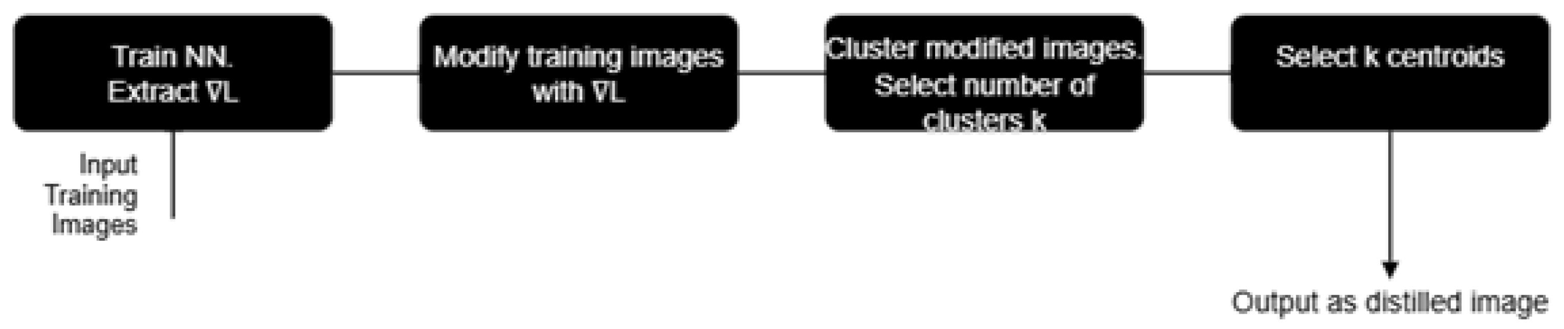 The key contribution of our paper is the development of a novel distillation method, which first trains a CNN with the original training images and uses the norm of the gradient of the loss function, at the last training epoch, to modify the training images. Then the K-means method clusters the modified images and selects the centroid of each cluster as a distilled image. Note that the image modification and clustering methods work consecutively and the user selects the number of clusters.