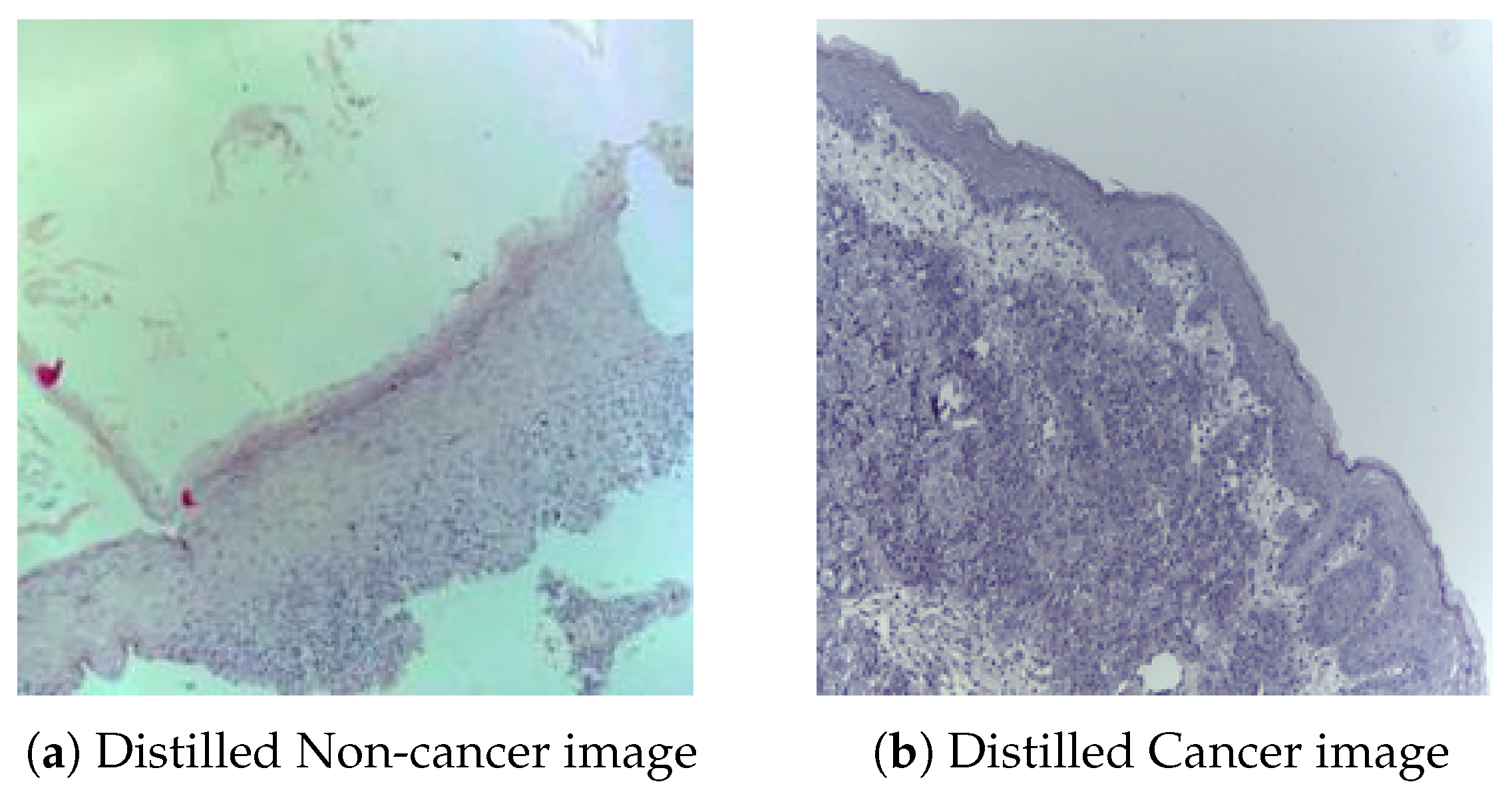 Table 5 extends our analysis to the medical image database OCID, evaluated using three convolutional neural networks (ResNet, Baseline, and LeNet). Two experimental scenarios were implemented: the first employed 20 distilled images (10 per class), while the second used the full dataset containing 2437 normal and 2511 cancerous oral images. For the ResNet model, the entire original OCID dataset achieved accuracies between 91.29% and 91.54% across 200–600 epochs, whereas training with distilled images yielded accuracies ranging from 72.50% to 91.80%. The gradual improvement with increasing the training epochs and the convergence toward full-dataset performance indicate that the distilled subset retains essential distinctive features even for complex medical imagery. Note that the classification after training with 20 distilled images showed a slightly higher accuracy than training with the entire set of 4.948 original training images. These results further confirm that our new method for dataset distillation can substantially reduce computational resources while maintaining high diagnostic accuracy.