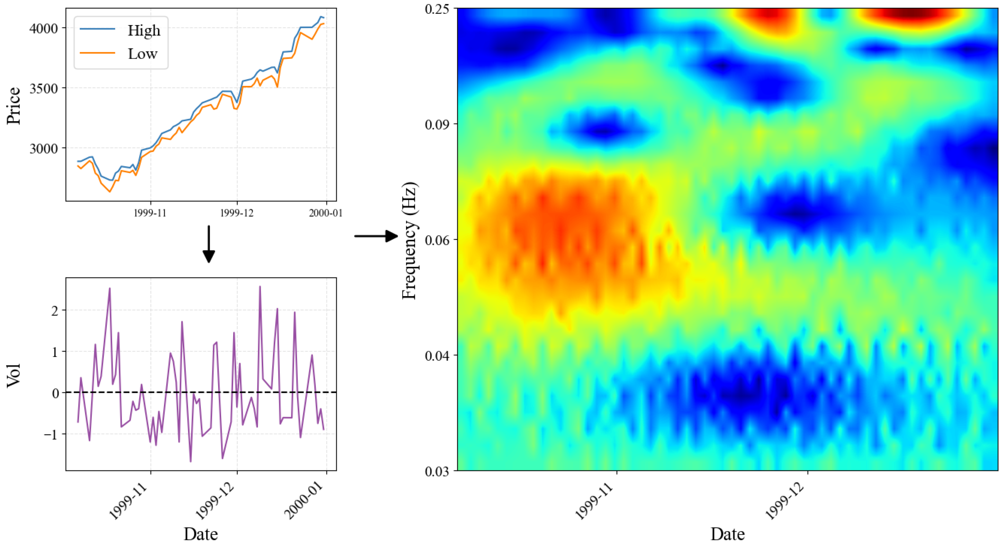 4]. Hybrid designs combining Convolutional Neural Networks (CNNs) for spatial features and LSTMs or Transformers for temporal learning have shown strong performance. Nevertheless, most models process time series in a one-dimensional form, potentially overlooking rich multi-scale temporal-frequency structures inherent in financial volatility.