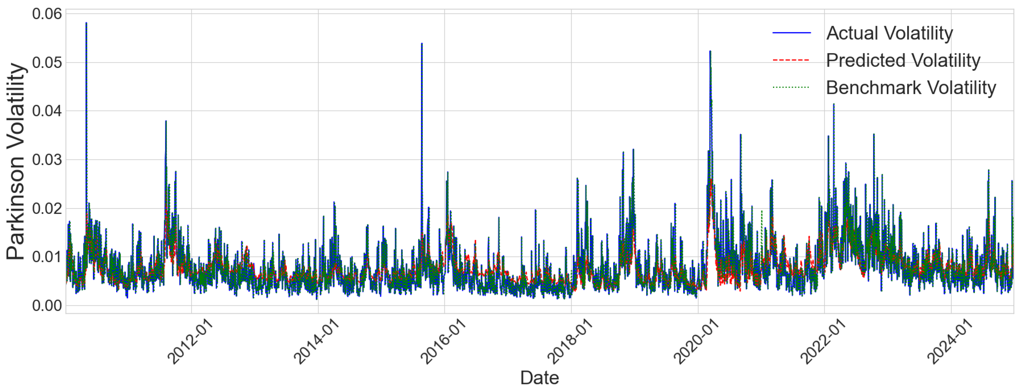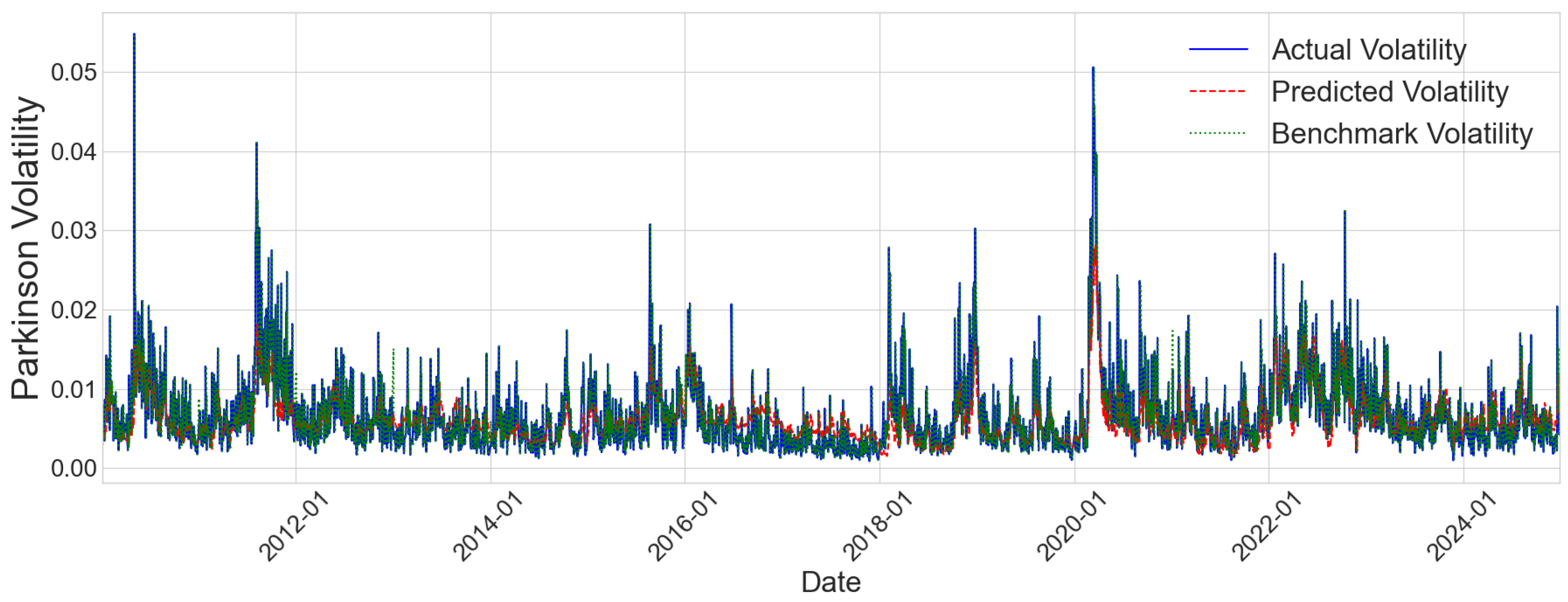 Close-based volatility has an obvious limitation in that it fails to reflect intraday price movements. To address this, we adopt Parkinson’s volatility, which utilizes daily high and low prices, as the target time series signal for analysis [