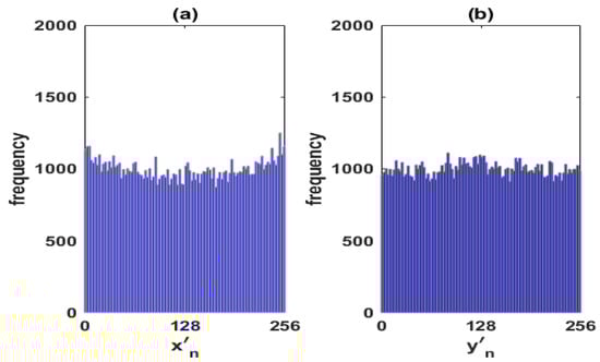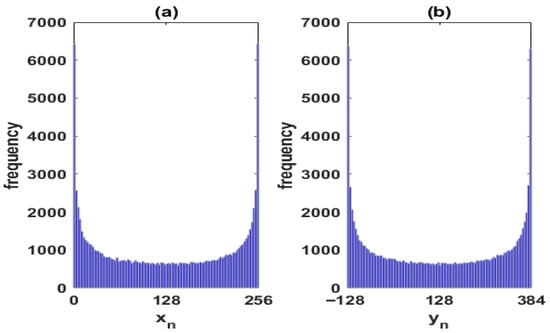 Figure 1 shows the U-shape distributions of the time series of the extended logistic map given by Equation (1) for the parameter : (a) and (b) . The goal is to generate time series with a uniform distribution. To achieve this goal, in the same spirit as [], we generate two chaotic time series by using the extended logistic map (1):