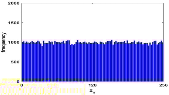 An image is codified by m different substitution boxes (S-box), that is, an S-box for each row of an image []. Each S-box is generated by a pseudo-random series , where is a segment of integer numbers from zero to 255. Note that the cardinality of is equal to the intensity levels of an image. However, the length of depends on the array that contains all the elements of . The S-box is generated according to how the different values of appear. The 256-intensity levels of each pixel in an image are modified according to time series . The chaotic time series are generated with the extended logistic map given by