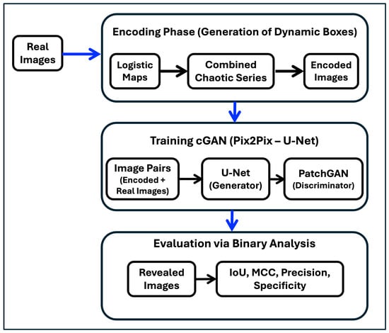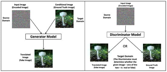 GANs are a type of deep learning model designed for generative tasks. They were introduced by Ian Goodfellow in 2004 [] and have become a hot area of research in machine learning and artificial intelligence. GANs have two main components: (i) a generator, a network that generates new data instances from random noise or a latent vector and whose goal is to produce data that are indistinguishable from real data; and (ii) a discriminator, a neural network that evaluates the data generated by the generator, distinguishing between real data from the database and fake data generated by the generator model. The objective of the discriminator model is to correctly identify real data from the generated data. We find that cGANs are well suited to address our problem of revealing encoded images, as the input image that the generator and discriminator incorporate during the training process is the encoded image for both networks; the real image is the conditional image for the generator model.