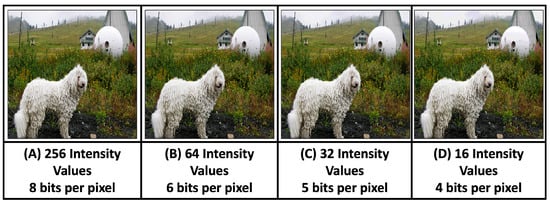 The figure shows the same image with 256- (A), 64- (B), 32- (C), and 16- (D) intensity levels. The image with 256-intensity levels was used to generate the other images, applying the algorithm designed for this purpose. Training and test datasets with 64-, 32-, and 16-intensity levels were created to conduct experiments to reveal images encoded using the Pix2Pix network. In each dataset, the encoded images also had the same intensity levels as the real images.
