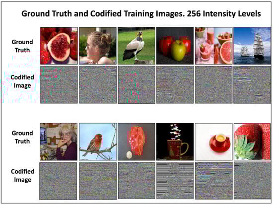 Figure 7 shows a set of 12 real images used in the training experiments. These images belong to the training dataset of 256-intensity levels. The corresponding encoded images are presented below each real image. Encoding completely hides the features of real images.