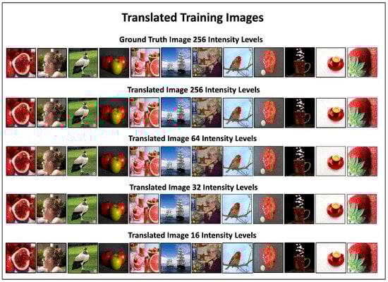 This section contains three categories of results: the results with training datasets, the results with test datasets, and the results of the inverse experiment along with the images obtained by double translation. In each case, except for the reverse experiment, results are presented with 256-, 64-, 32-, and 16-intensity levels. In addition, RGB image translation analyses based on intensity histograms are performed. These results are discussed briefly here in a qualitative manner, leaving the quantitative analysis based on image metric scores for the Section 4.
