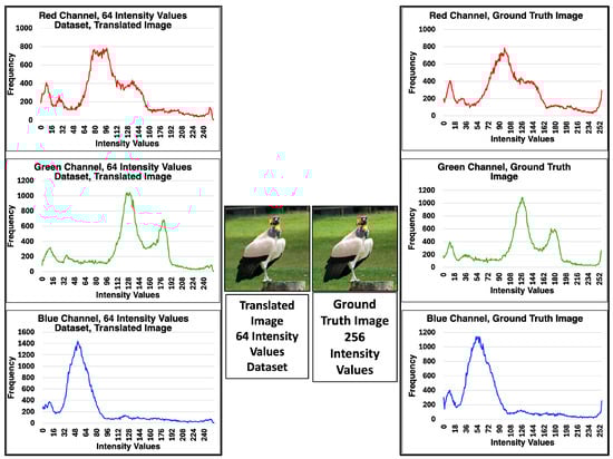 One way to assess the quality of translated images is through their intensity histograms. Indeed, a comparative analysis of the intensity histograms of the translated images versus the ground truth images allows us to visualize, in each RGB channel, the cGAN’s ability to reproduce the ground truth images. Figure 9 shows the intensity histograms of the translated image with 64-intensity levels (left) and the ground truth image of 256-intensity levels (right); the images from which the histograms were obtained are also shown. The images and histograms show a high degree of agreement. Note that the originally translated image with 64-intensity levels recovers the 256-intensity levels.