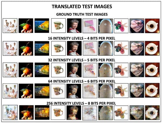 The translated images obtained in the experiments with the four test datasets (16-, 32-, 64-, and 256-intensity values) are presented. Translating training images assesses cGAN’s ability to learn a specific task, in this case, revealing encoded images, a complex task in itself. Once the training process is complete, and if all goes well, the trained model is expected to be able to translate, in addition to the 1505 images in the training dataset, any other unknown encoded image that was not in the training dataset, which is a more complex task. In this case, we are considering an image encoded according to the process described in the Introduction. Therefore, revealing an encrypted image from the test dataset is an important evaluation for the neural network in which its prediction ability is tested, and the result is important for the research area of cryptanalysis. The translated images of the four test datasets having different intensity values are presented. For all datasets, the same set of 12 translated test images is shown to facilitate comparison between the experiments performed. The quantitative analysis of the translated test images is presented in Section 4.