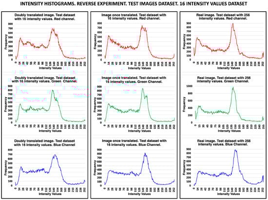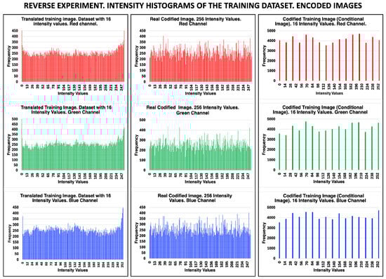 Histograms (Figure 14) show the intensity values of the three RGB channels of the encoded images shown in Figure 15. The left column shows the intensity histograms of the channels of the translated training image obtained in the reverse experiment. The second column shows the three channels of the actual 8 bpp-encoded images. The right column presents the channels of the 4 bpp-encoded image, which, in this experiment, is the conditional image of the generator model. In the first and second columns, it can be seen that the histograms of the translated encoded image with 16-intensity values and those of the real image encoded with 256-intensity values present a homogeneous frequency distribution in the range [0, 255], as expected from a well-encoded image. It should be noted that the translated encoded image was processed having as input and conditional images images with 16-intensity values and that, after being processed, it acquired tones in the entire intensity range [0, 255].