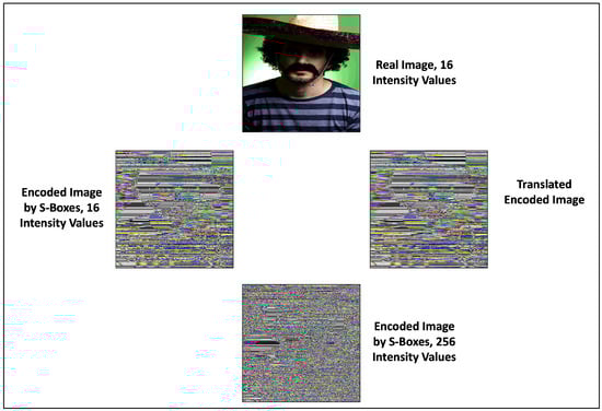 Images used to generate the histograms in Figure 14. The three encoded images belong to the training dataset. For the inverse experiment, the input image is the real image (top), the translated image encoded by the cGAN and the one encoded by S-Boxes are in the middle. Finally, the 256-intensity image, also encoded by S-Boxes, is shown as a reference at the bottom.
