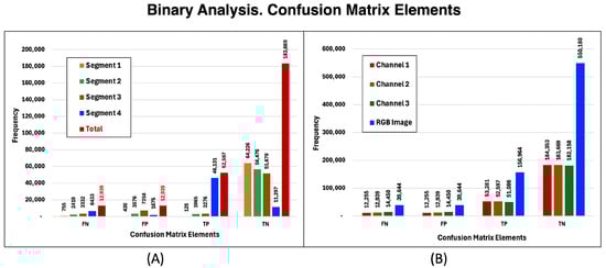 The results obtained from a binary analysis of a generated and a real image are shown in Figure 17. Graph (A) illustrates the result of performing a binary analysis on a single image channel; the four segments are broken down and for each segment the elements of the confusion matrix TP, TN, FP, and FN are shown. On the right side, graph (B), the results for the three channels of an RGB image appear; each element of the confusion matrix is broken down by channel and by the total RGB image.