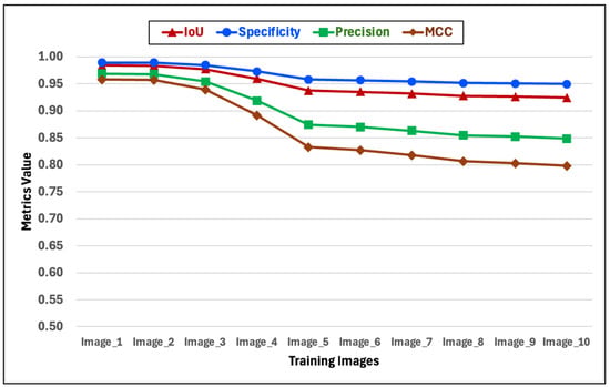 Reverse experiment. Metrics for the double-translated training images. The average values for the specificity, IoU, precision, and MCC metrics are 0.95, 0.93, 0.85, and 0.80, respectively. These scores are high and comparable with those obtained by the training images in the normal process (Figure 19 and Figure 20) despite having double translation.