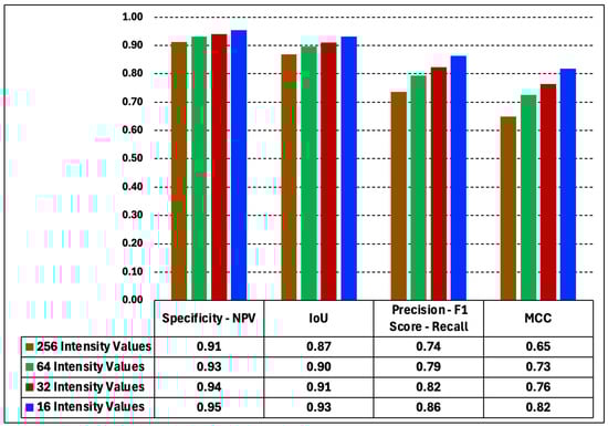 In Figure 24 we plot the average values of the metrics obtained for a set of 10 translated test images. The figure clearly shows the effect of varying the number of intensity values on the test image metrics. Specificity, IoU, Precision, and MCC metrics show the same behavior in all test datasets. The metrics improve as the intensity values of the datasets decrease. Unlike training images, which are not affected by the number of intensity values (Figure 21), the test images are very sensitive to the number of intensity values.