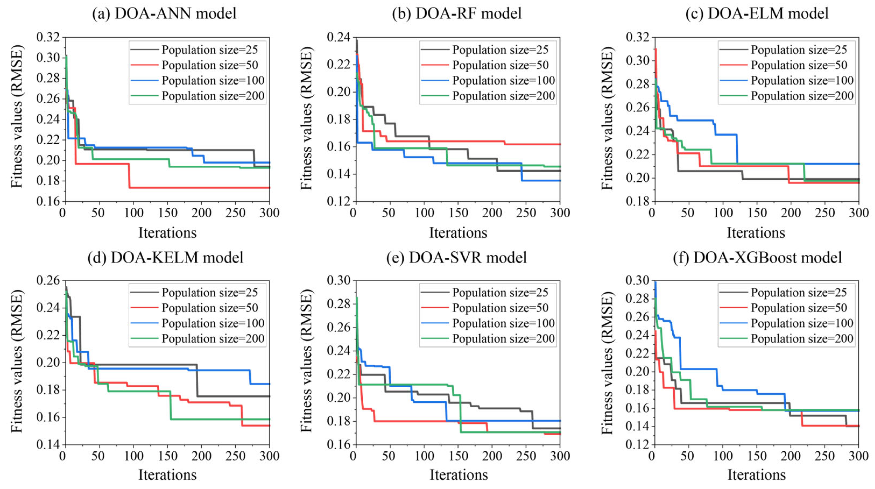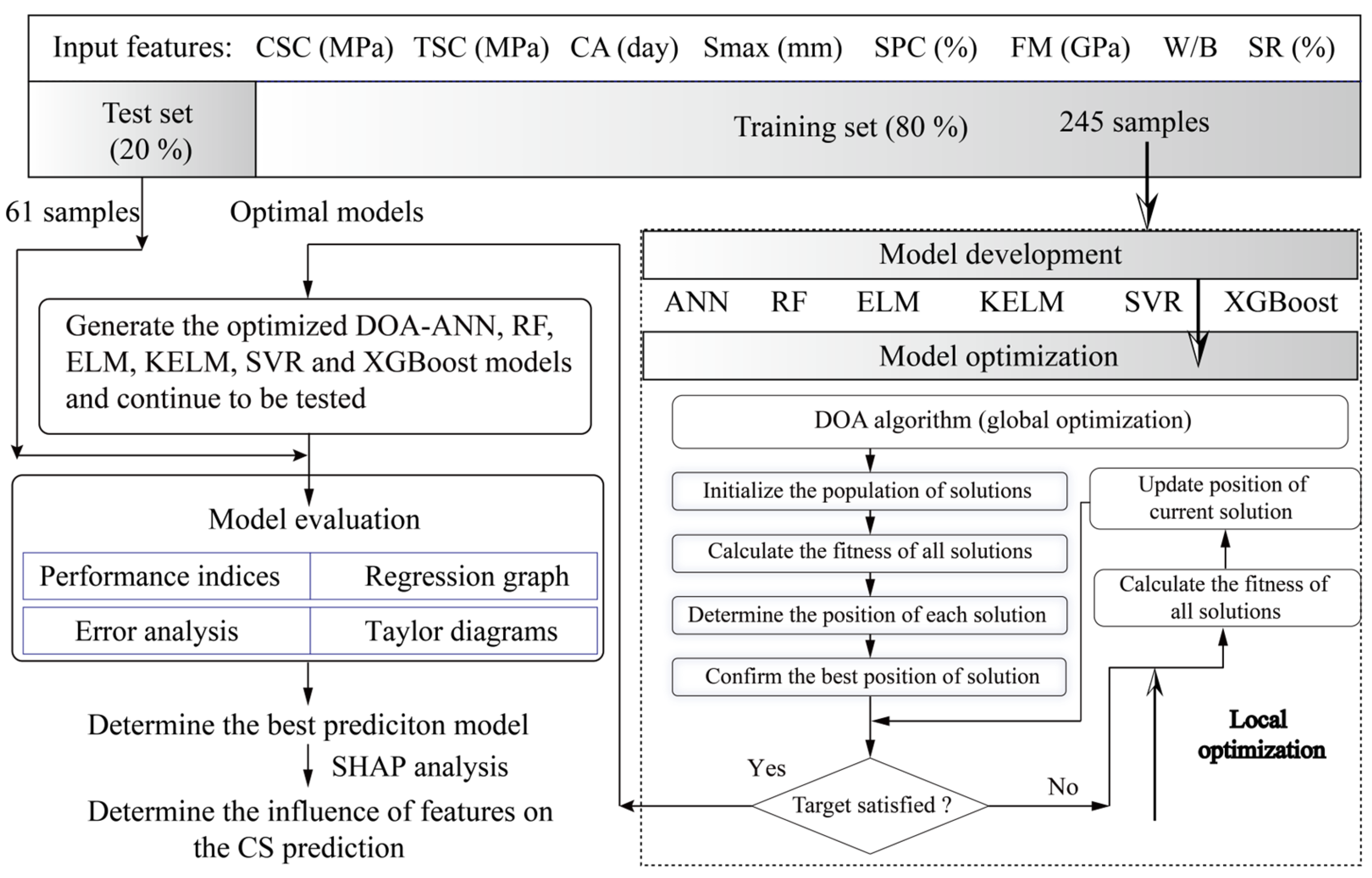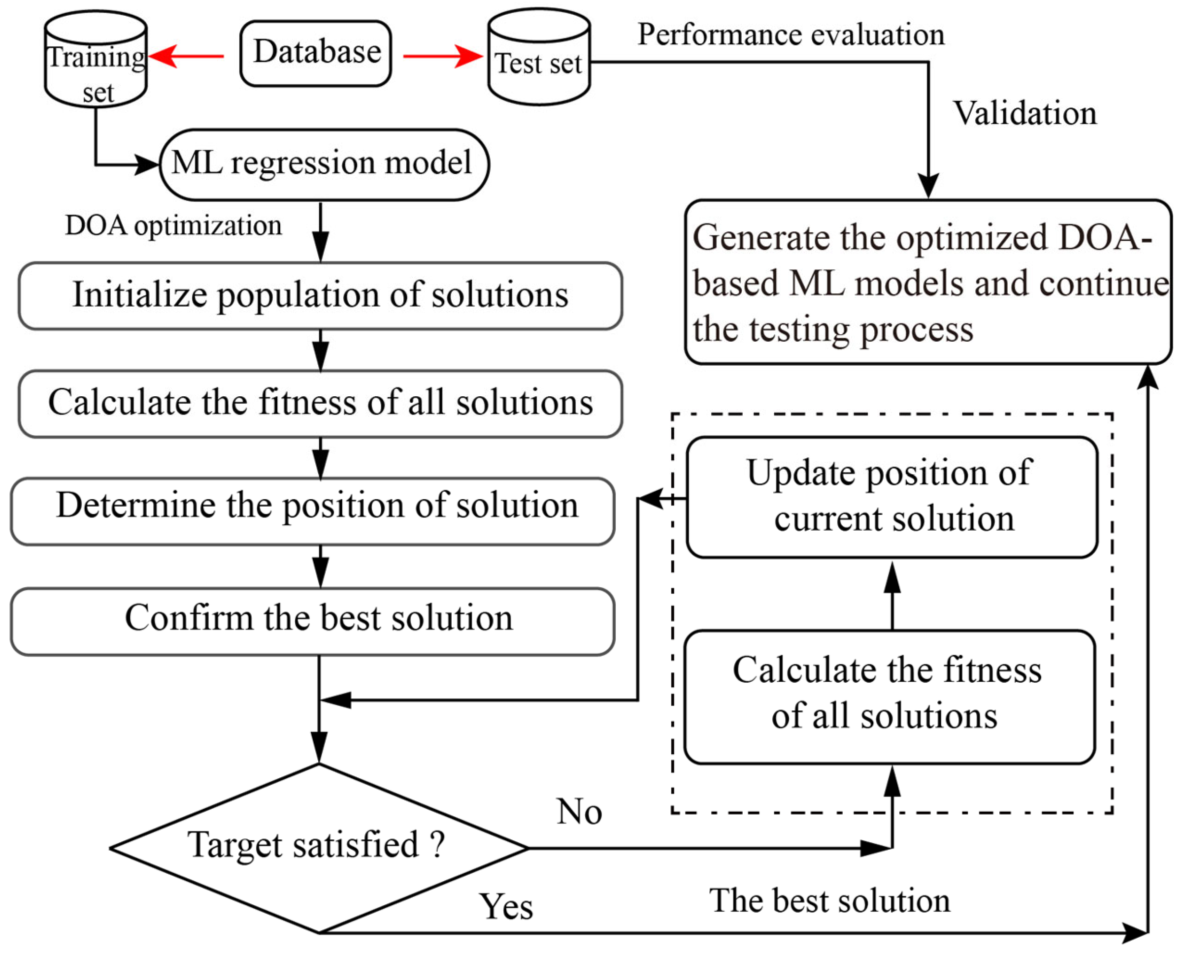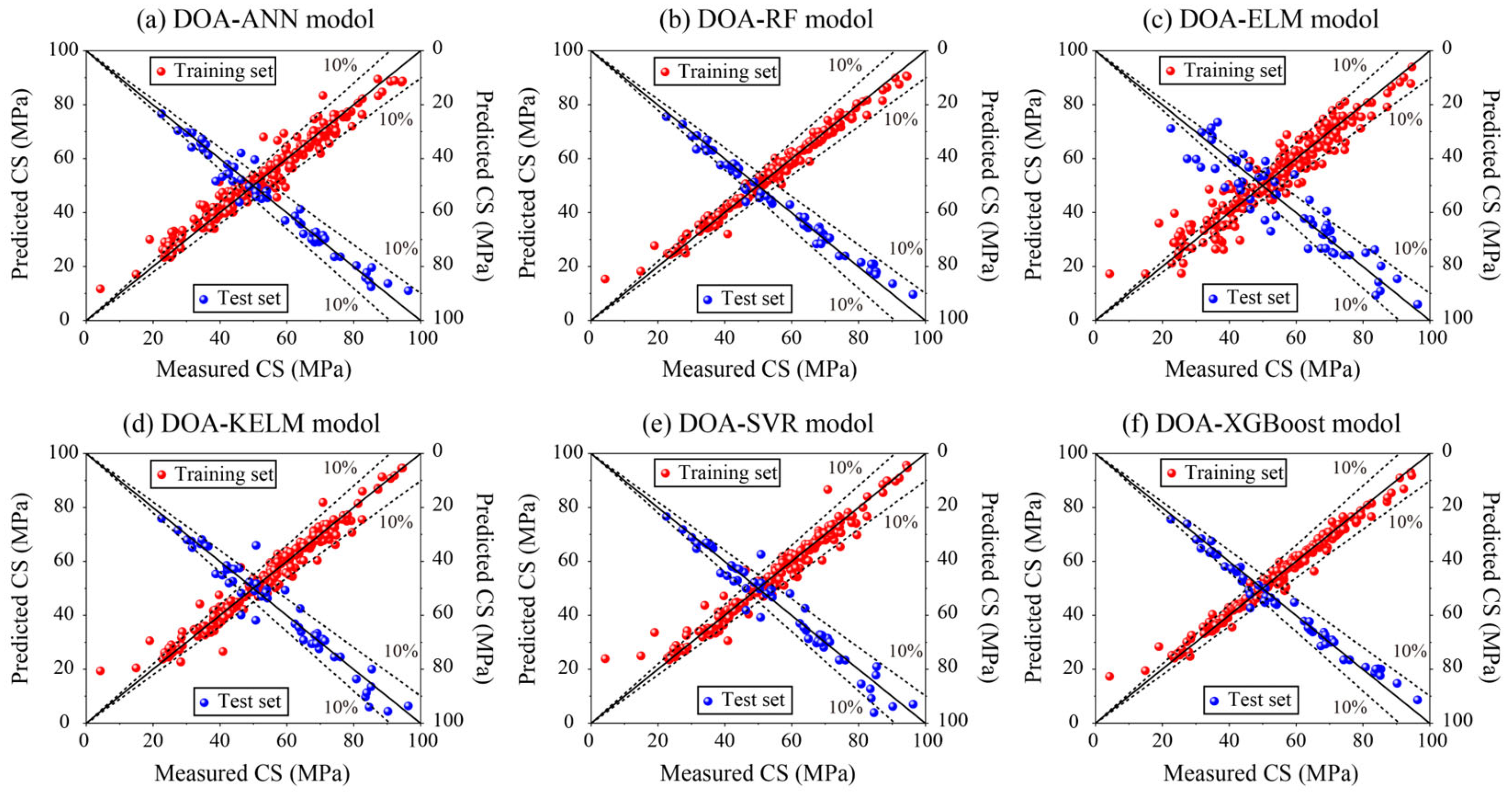 - The introduction of DOA significantly improved predictive performance compared with previously reported optimization techniques such as BBO and MTOA. This demonstrated that algorithmic selection is critical for enhancing the accuracy of ML-based predictions in materials engineering.