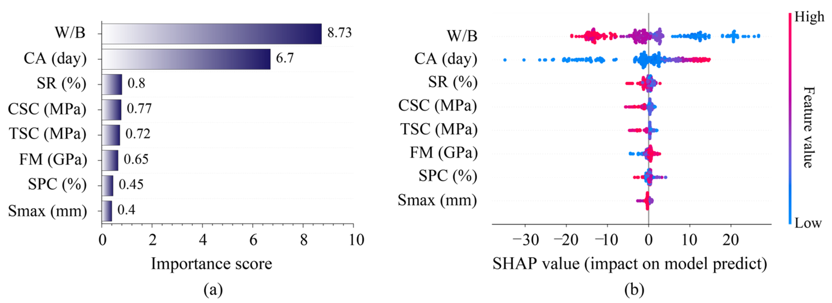 - SHAP analysis confirmed that the W/B and CA are the dominant predictors of compressive strength. W/B showed a negative correlation with strength, whereas CA contributed positively to long-term strength development.
