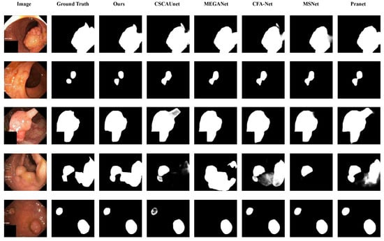 As shown in Figure 8, for the fourth input image, it can be observed that the segmentation results of CSCA U-Net, MSNet, and PraNet are incomplete, whereas our method achieves segmentation results closer to the ground truth.