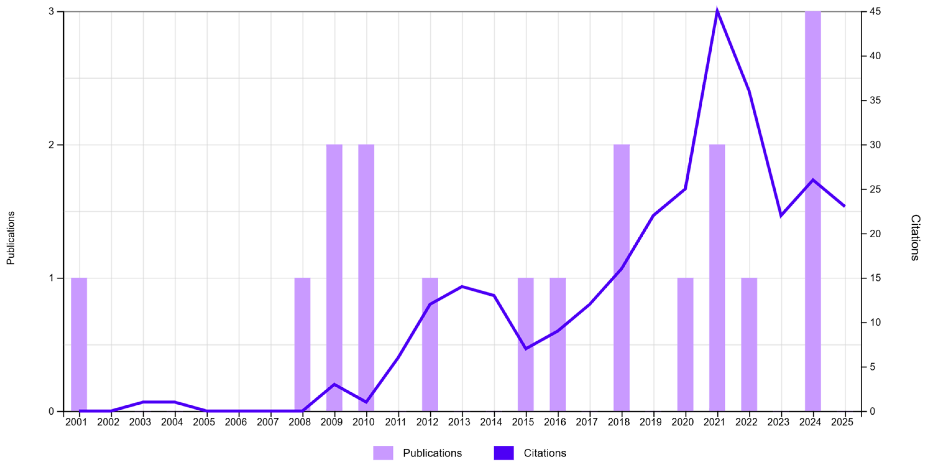 Figure 3 above summarizes the temporal trend of publications and citations for the joint query (15 items overall). The most relevant specific studies from WoS are listed in