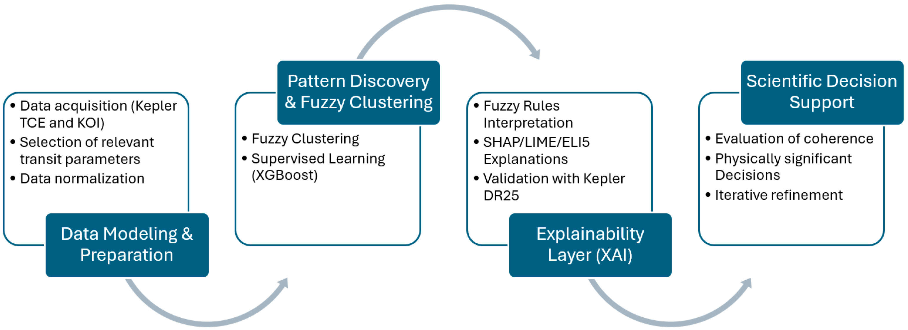 The framework integrates three complementary components: fuzzy clustering, modeling uncertainty and discovering latent structures in the feature space; supervised learning, to predict the probability that a transit signal corresponds to a genuine exoplanet; and XAI, which provides transparent and interpretable explanations of both the clustering behavior and the predictive outcomes (see