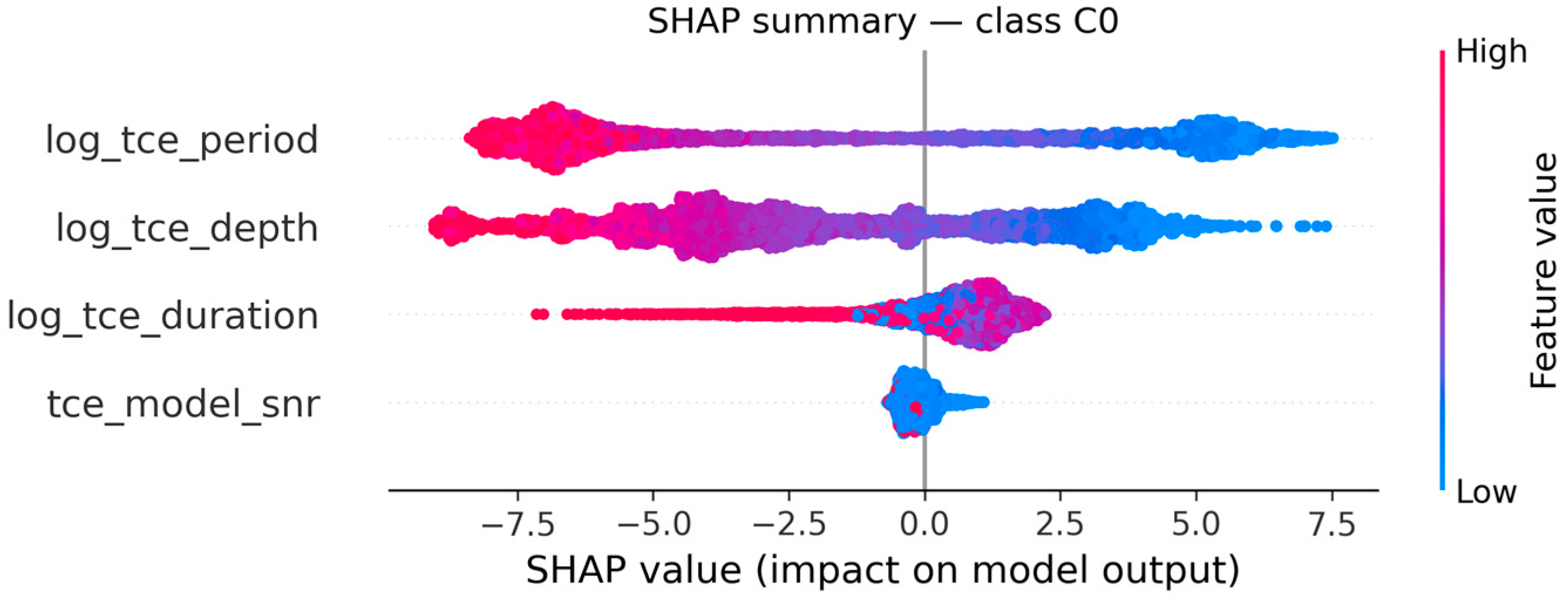 The analysis reveals that tce_model_snr (signal-to-noise ratio) and log_tce_depth (transit depth) are the most influential predictors, followed by log_tce_period and log_tce_duration. These four parameters correspond to core descriptors of the transit signal shape and quality, reflecting the model’s reliance on physically interpretable features.