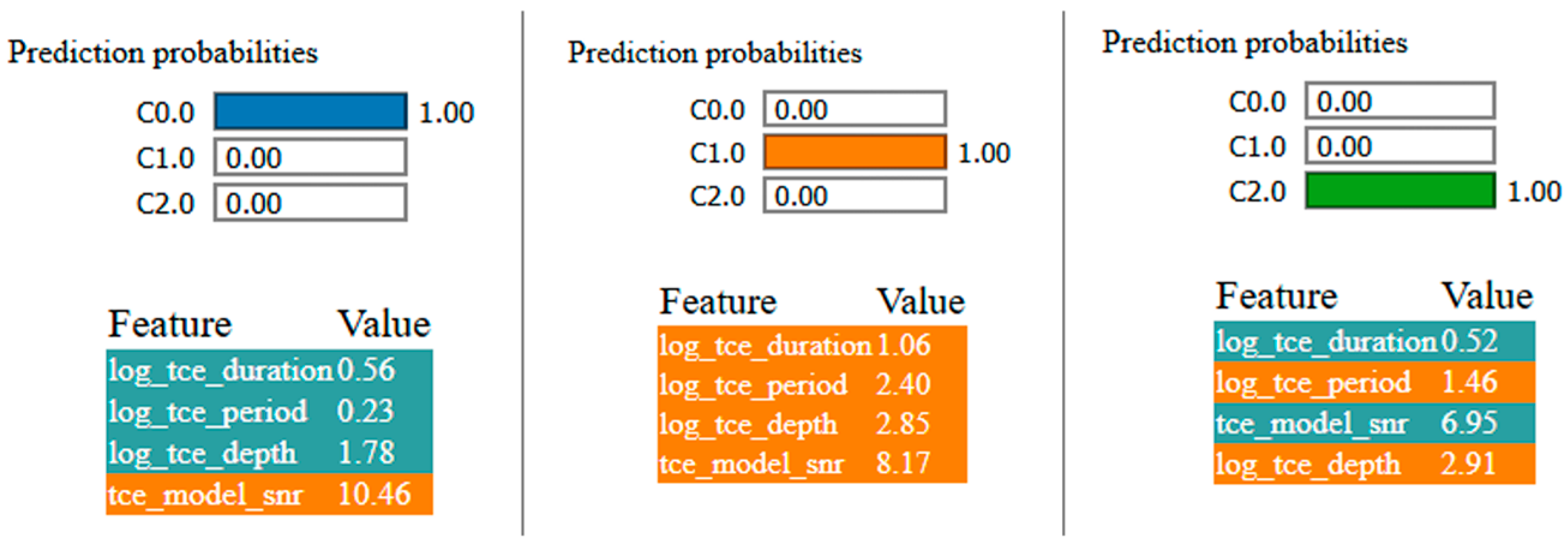The combination of XGBoost and XAI tools provided interpretability at two complementary levels of the FAS-XAI pipeline. In the cluster consistency phase, SHAP, LIME, and ELI5 were applied to the model trained to reproduce fuzzy memberships, revealing the main factors driving each cluster and offering both global and local explanations of the fuzzy segmentation. In the KOI classification phase, SHAP values were used to interpret the supervised model distinguishing CONFIRMED, CANDIDATE, and FALSE POSITIVE cases, identifying the signal and fuzzy variables that most strongly influenced each disposition.