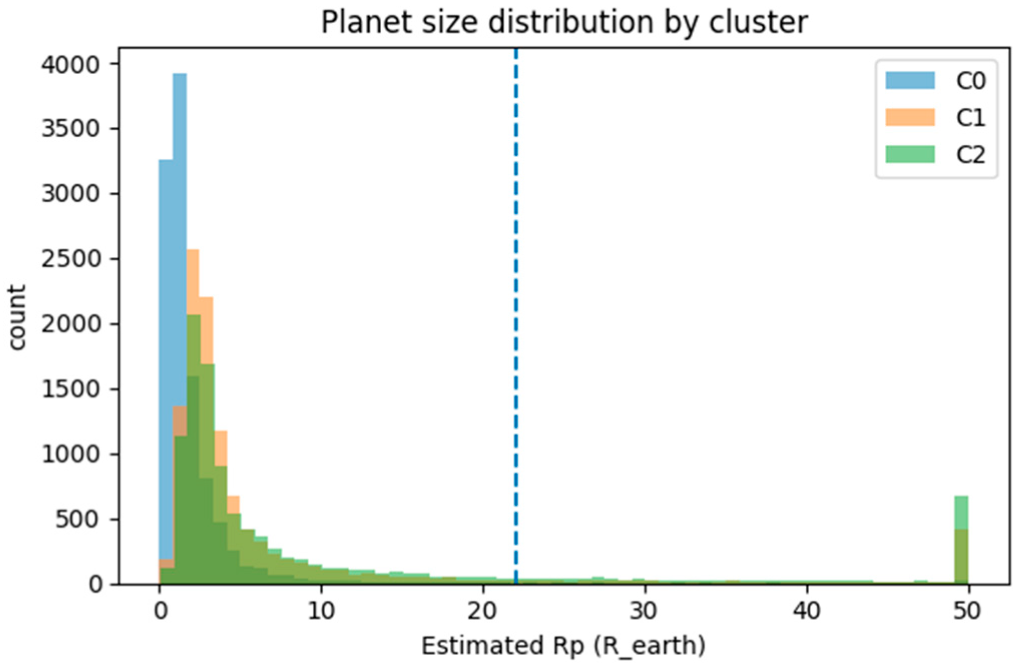 Additional validation using stellar parameters from Kepler DR25 confirmed that the fuzzy clusters correspond to physically consistent regimes of planetary size, orbital distance, and duration anomaly. Cluster C0 concentrates short, near-central, terrestrial-size events; C1 captures long-period, high-impact or eccentric transits; and C2 represents intermediate, high-SNR signals that include both genuine planets and astrophysical false positives.