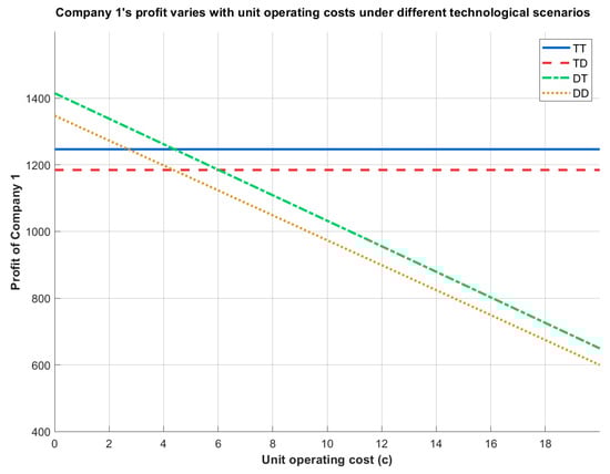 Company 1’s profit varies with unit operating costs under different technological scenarios.