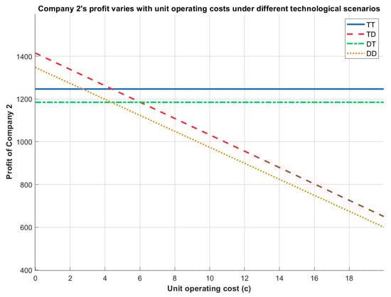 Company 2’s profit varies with unit operating costs under different technological scenarios.
