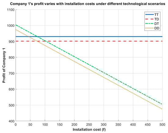 Company 1’s profit varies with installation costs under different technological scenarios.