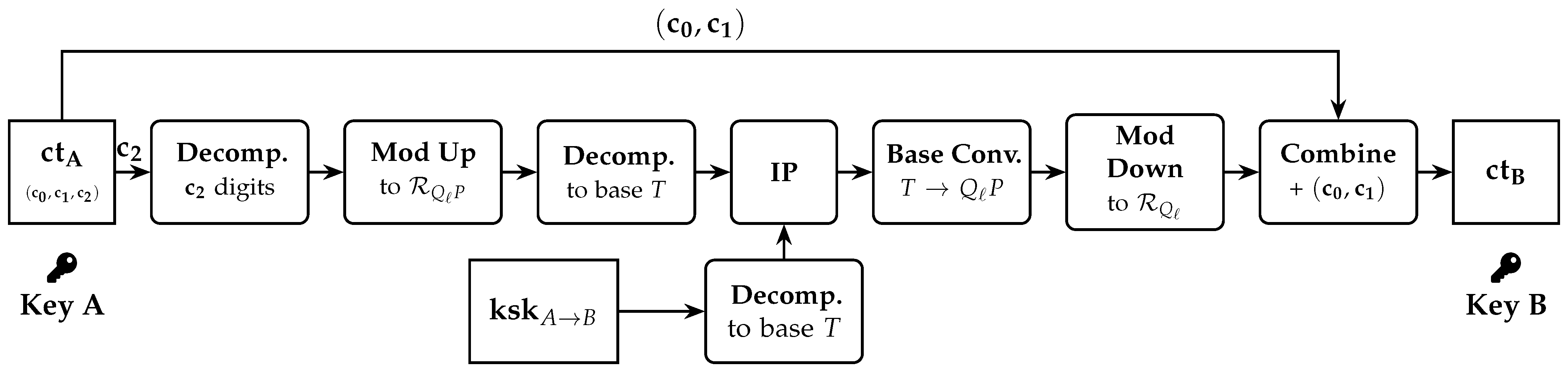 - Mono, J.; Güneysu, T. A New Perspective on Key Switching for BGV-like Schemes. IACR Trans. Cryptogr. Hardw. Embed. Syst. 2025, 2025, 763–794. [Google Scholar] [CrossRef]