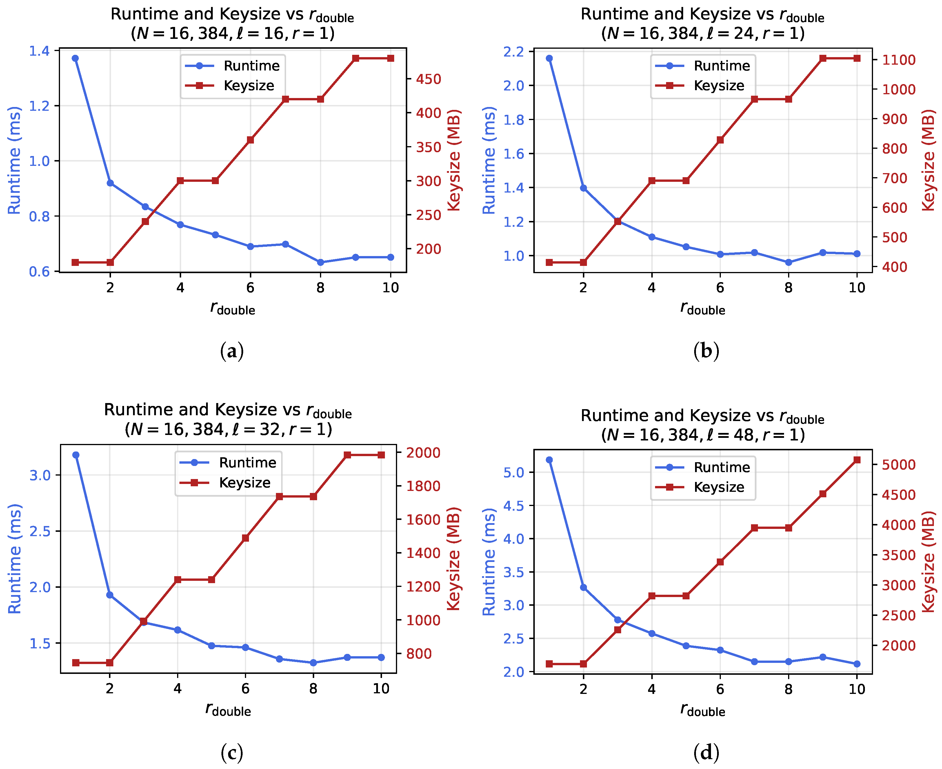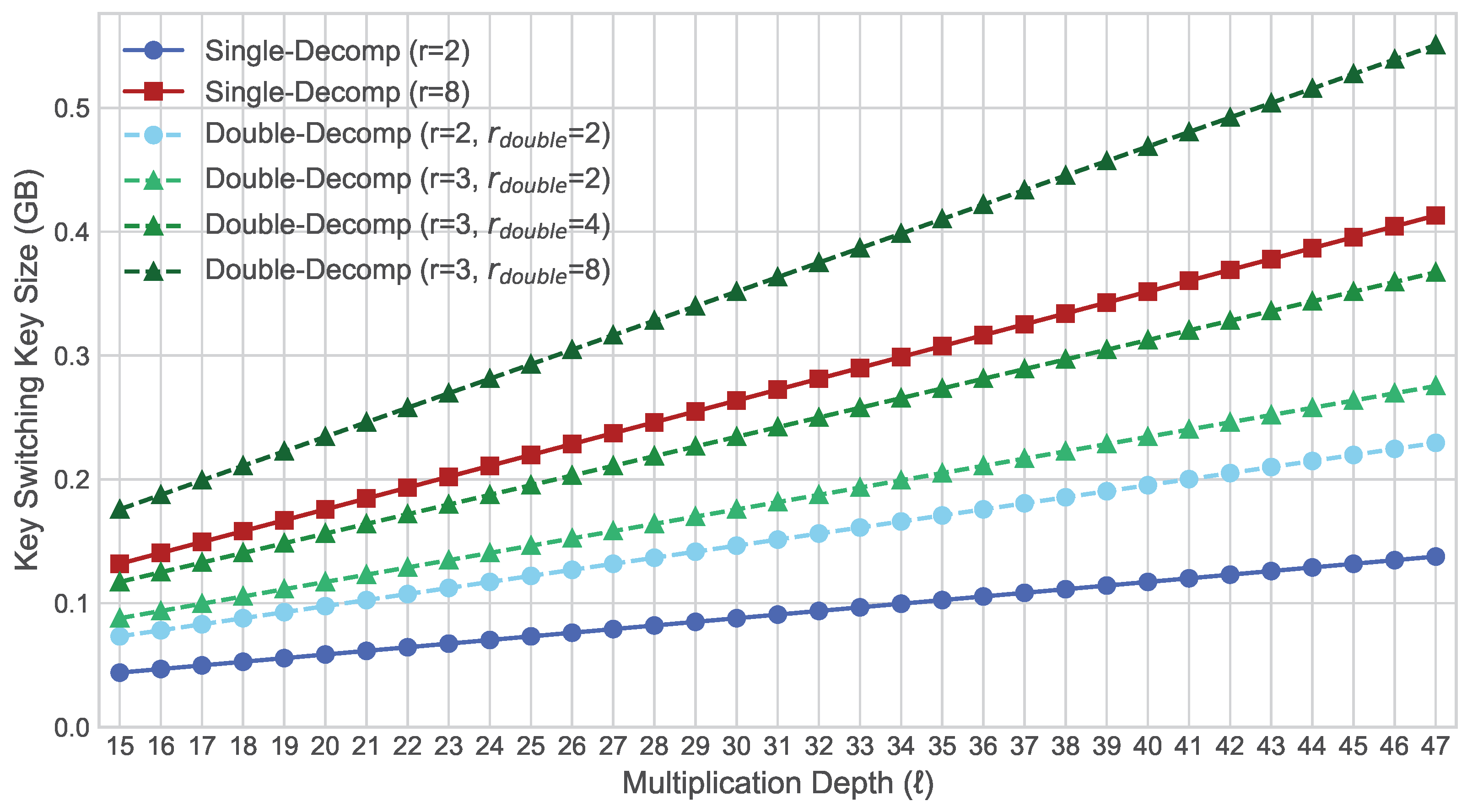 - The Cost of Double Decomposition: The penalty is even more pronounced with double decomposition. As shown in the figure, moving from ‘Double-Decomp (r = 3, rdouble = 2)’ to ‘(r = 3, rdouble = 8)’ causes a steep rise in key size. Crucially, for comparable parameters, double decomposition consistently requires more memory than single decomposition.