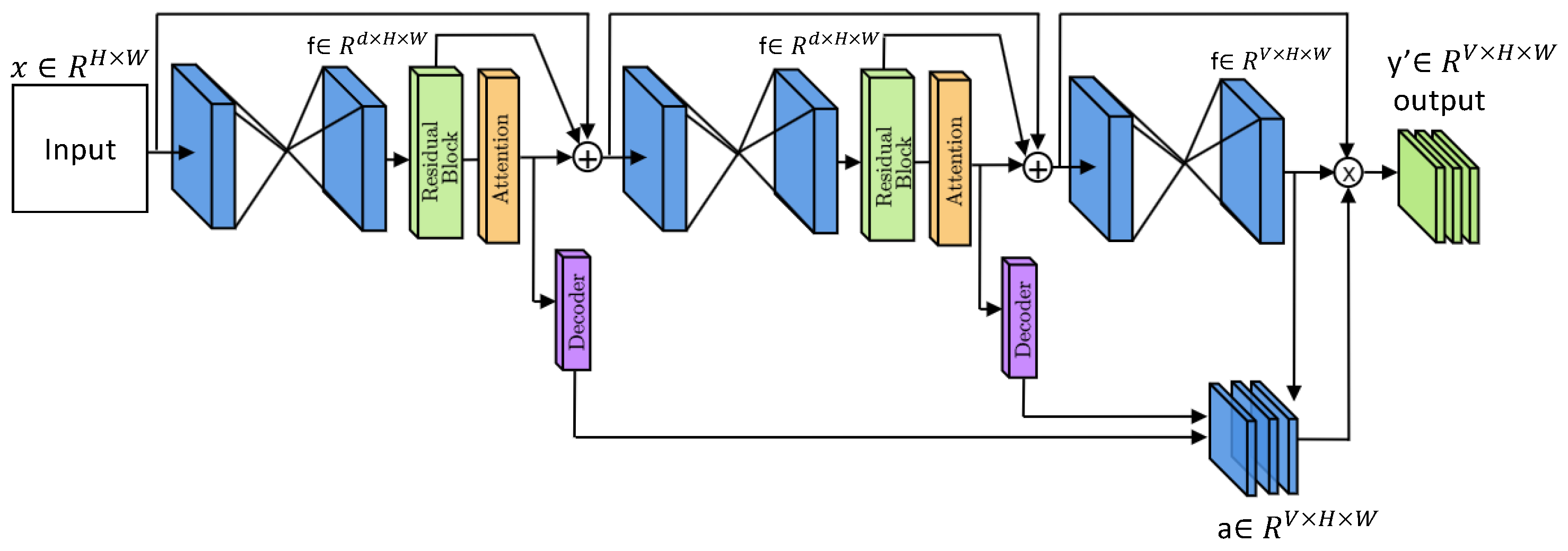 intermediate outputs followed by a final prediction. This setup leverages multiple levels of representation offered by the N-stacked hourglass networks. To further enhance the representational capacity, we introduce a multi-scale attention mechanism. In this mechanism, each hourglass network generates an intermediate representation, which is combined to create a comprehensive multi-level representation. This integrated representation consolidates insights from different network levels, refining the final representation. By harnessing this combined knowledge as a guiding signal, we aim to optimize the representation space. To implement this, we stack all intermediate representations and feed them through an attention block comprising 1 × 1 convolutions with sigmoid activation, resulting in a