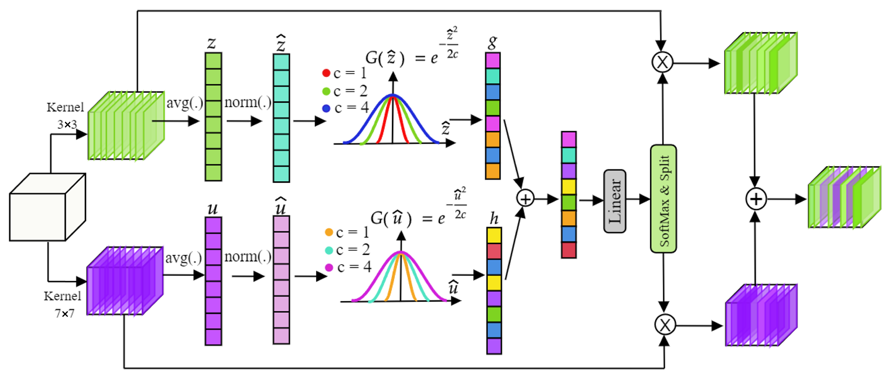In this work, our objective is to enhance the network’s representational capabilities through the utilization of a specific attention mechanism called M-GCA. This module is crafted to recalibrate contextual information across various scales by dynamically selecting receptive fields from both global and local streams. M-GCA incorporates a dual-path module, integrating convolution, global average pooling, normalization, and Gaussian context excitation in two paths with kernel sizes of 3 × 3 and 7 × 7. This design enables the module to prioritize relevant features by adjusting receptive field sizes dynamically. Consequently, the network can selectively focus on the most informative features for the given task, disregarding irrelevant or noisy data, thereby enhancing the discriminative power of its feature representation.