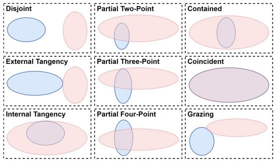 Schematic illustration of intersection regimes highlighting disjoint, external tangency, internal tangency, partial two-point overlap, partial three-point overlap, partial four-point overlap, contained, coincident, and grazing configurations.