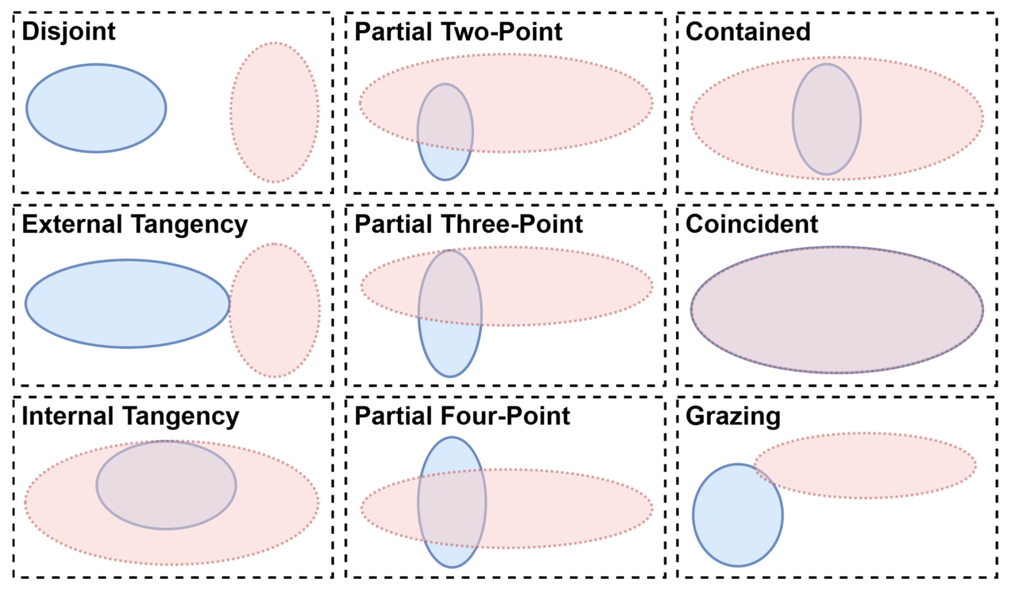 Figure 1. These include disjoint, external tangency, internal tangency, partial two-point overlap, partial three-point overlap, partial four-point overlap, contained, coincident, and grazing.