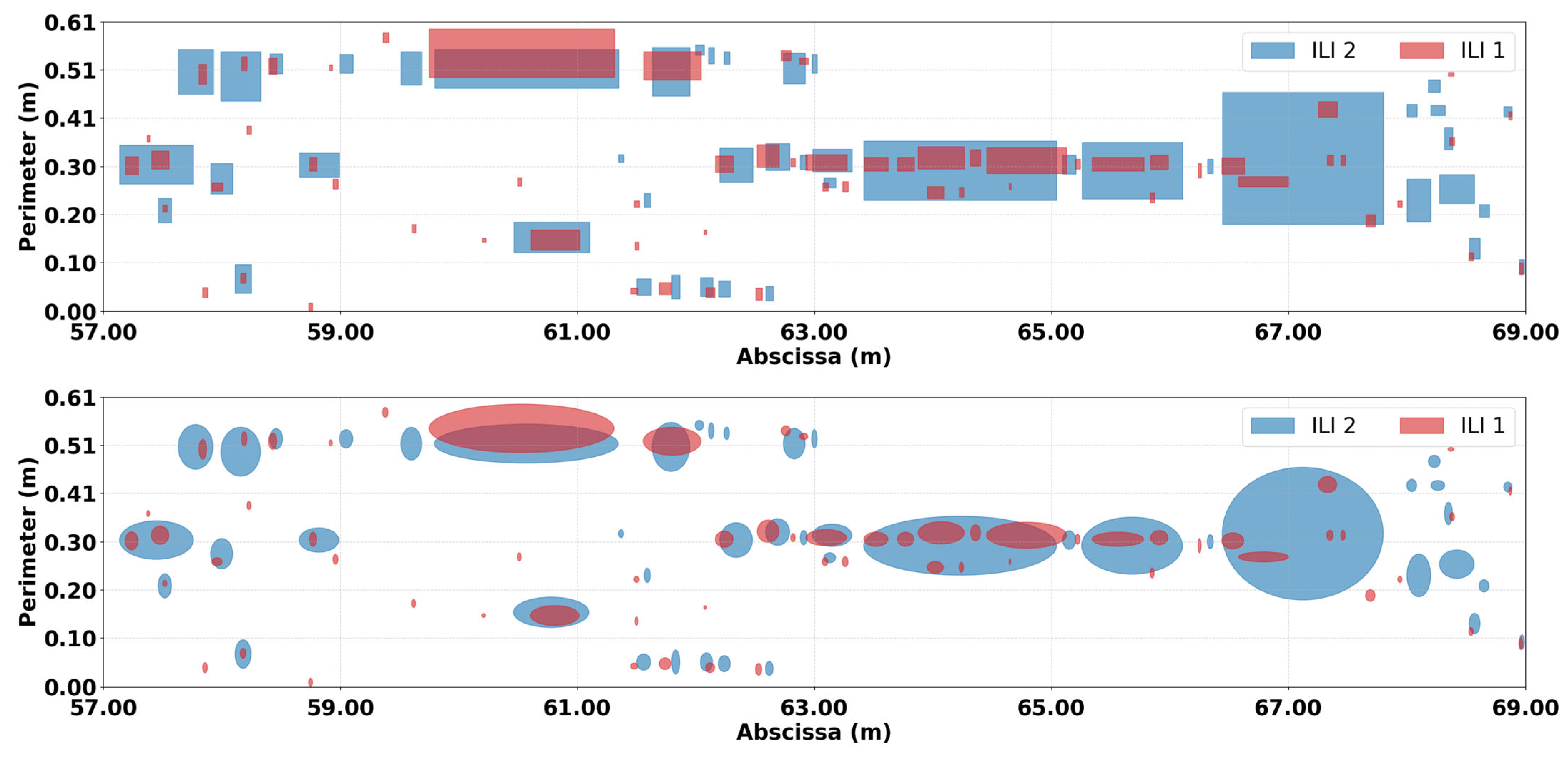 A 12 m water-injection pipeline section with an outer diameter of 219 mm and a wall thickness of 12.7 mm is used as the real-world dataset for evaluating the proposed quadrature formulations. The corrosion features from two successive ILIs are represented using both axis-aligned rectangular boxes and axis-aligned ellipses derived from the reported dimensions, as illustrated in