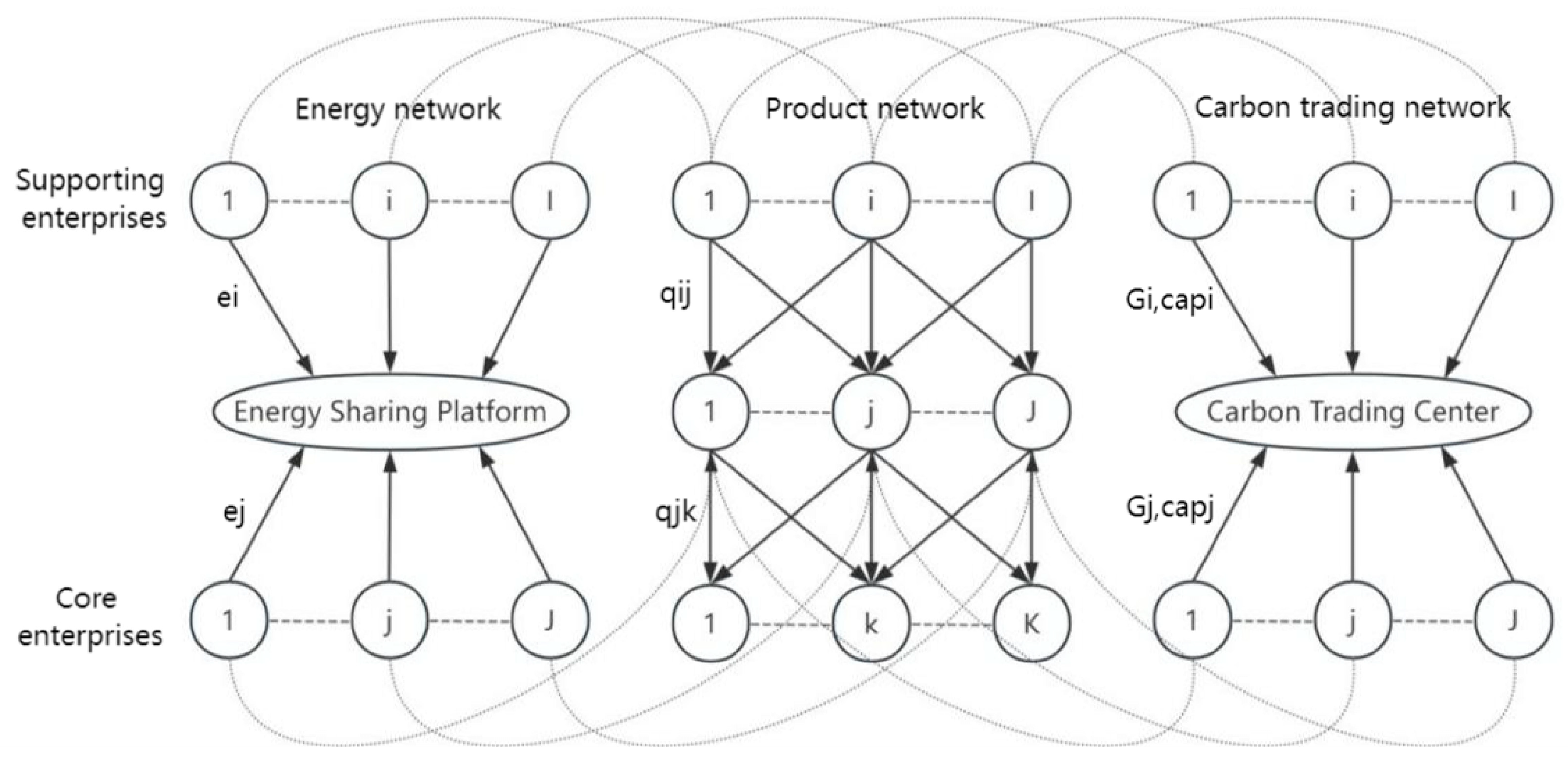 At the same time, carbon neutrality is gradually becoming a shared global goal, with governments around the world formulating corresponding low-carbon policies, including carbon subsidies, carbon trading, and carbon taxes [5]. Among these, market-based carbon trading systems are widely regarded as an effective method for controlling carbon emissions [6]. The core of this mechanism lies in treating carbon emission rights as a scarce resource, allowing enterprises to buy, sell, and trade in the carbon market, and through economic incentives, encouraging enterprises to reduce carbon emissions and promote green and low-carbon development [7]. Under the joint action of a carbon emissions trading mechanism and distributed energy sharing model, the industrial park network composed of core enterprises and supporting enterprises expands from a single production network to a supernetwork structure containing a production network, energy network, and carbon trading network. The interdependence and interaction between multiple networks have transformed the production decisions of enterprises from single-objective decisions to complex decisions with multi-objective attributes. In this case, the challenge of realizing the equilibrium of production flow, energy flow, and carbon trading flow is a realistic problem that enterprises need to solve. Accordingly, this paper establishes a distributed energy sharing supernetwork model for industrial parks under the carbon emissions trading mechanism, solves the network equilibrium decision of enterprises, and systematically analyzes the influence of the carbon limit and carbon trading price on the equilibrium strategy of the distributed energy sharing network of industrial parks. Although existing research has made significant progress in the balancing of supply chain networks and carbon trading mechanisms, most of them have focused on single networks or two-tier structures, such as production carbon trading and energy trading. There is no study that systematically integrates the triple supernetwork structure of production networks, energy networks, and carbon trading networks, especially in the context of distributed energy sharing in industrial parks. To fill that gap, this paper constructs a supernetwork model for distributed energy sharing in industrial parks under the carbon trading mechanism, solves the optimal product trading volume, low-carbon energy level, and carbon trading decisions in the network equilibrium state, and systematically analyzes the impact of a carbon cap and carbon trading prices on the low-carbon energy level and system profits. Specifically, this article aims to answer the following questions: