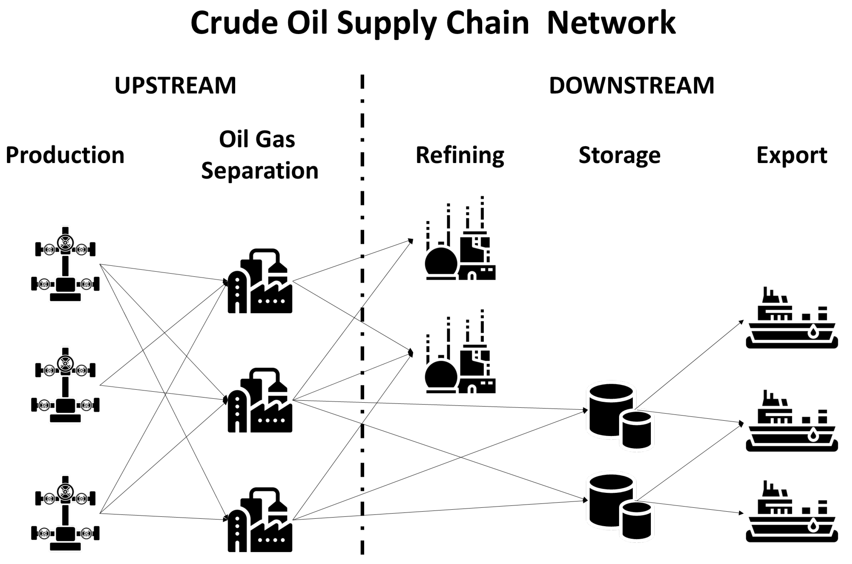 The crude oil industry involves the process from the point of detection of crude oil to the final delivery to customers across the world. The crude oil industry is usually divided into two segments, upstream and downstream. Each segment includes a large network of equipment and facilities for crude oil production, treatment, processing, and transportation. In the upstream segment, the crude oil is produced from oil fields and sent to be treated in oil and gas separation plants, where the gas and water associated with the crude oil are removed. The downstream segment starts with treated crude oil that supplies different facilities through pipelines. Those facilities can be refineries where the crude oil is processed or crude oil terminals (COT) where it is stored and shipped to customers using crude oil carriers, as illustrated in