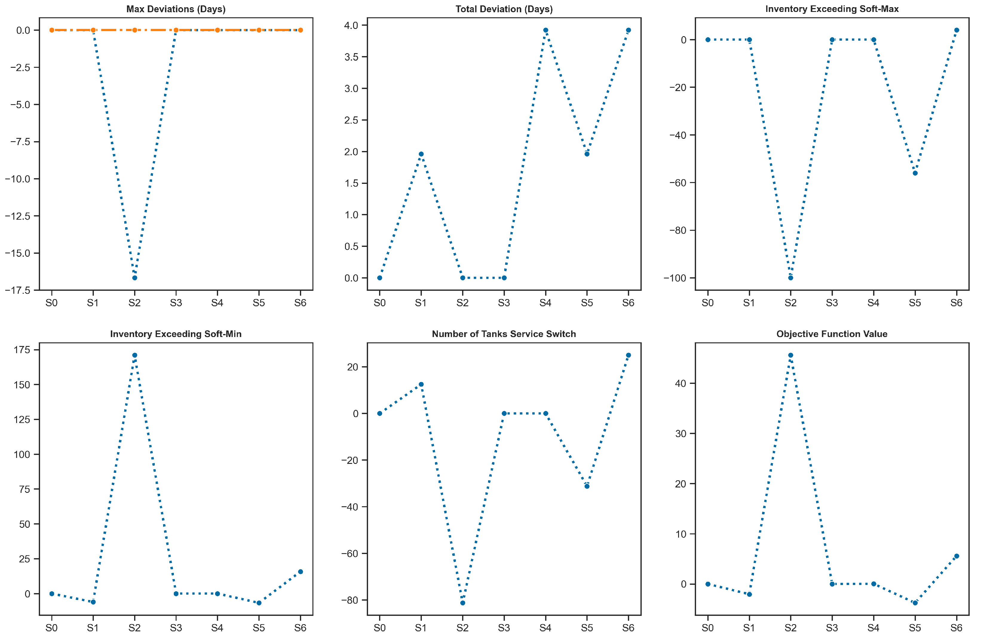In summary, Scenario S2, which corresponds to a reduction of 500 units in loading capacity, exhibits the most pronounced influence across all key performance indicators. Although Scenario S2 has a positive effect on max deviations, total deviations, the inventory exceeding soft max, and number of tank service switches, it performs very poorly with respect to the objective function value as well as the inventory exceeding soft min. Furthermore, Scenario S5, which corresponds to an increment in tanks by 1 unit, shows promising results with respect to all the performance indicators. This finding underscores the critical roles of loading capacity and number of tanks in determining overall system performance.