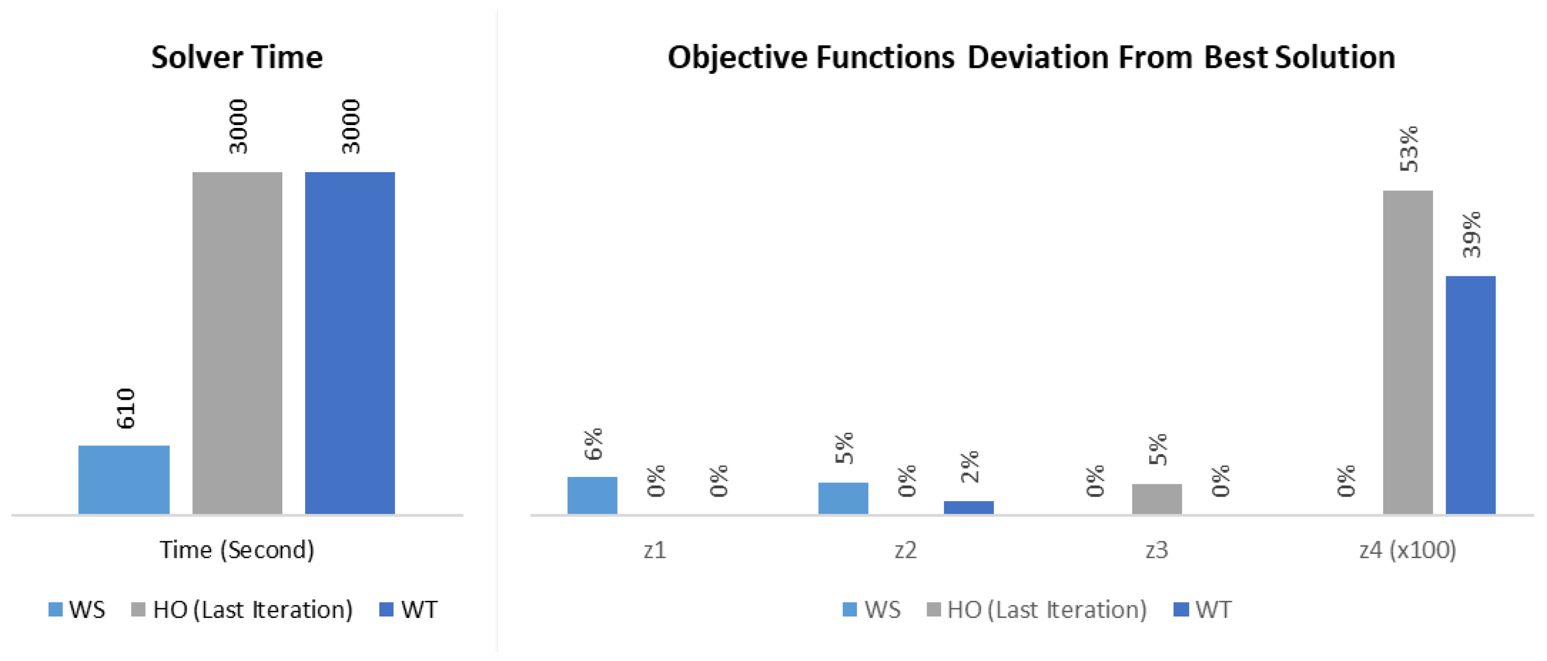 The WS model dominated the other two in the time required to solve the problem, with one iteration that required 610 s to be solved, against multiple iterations for the HO and WT, some of which took up to 3000 s. Moreover, the HO and WT approaches produced better solutions compared to the WS method in alignment with the prioritization of business objectives.