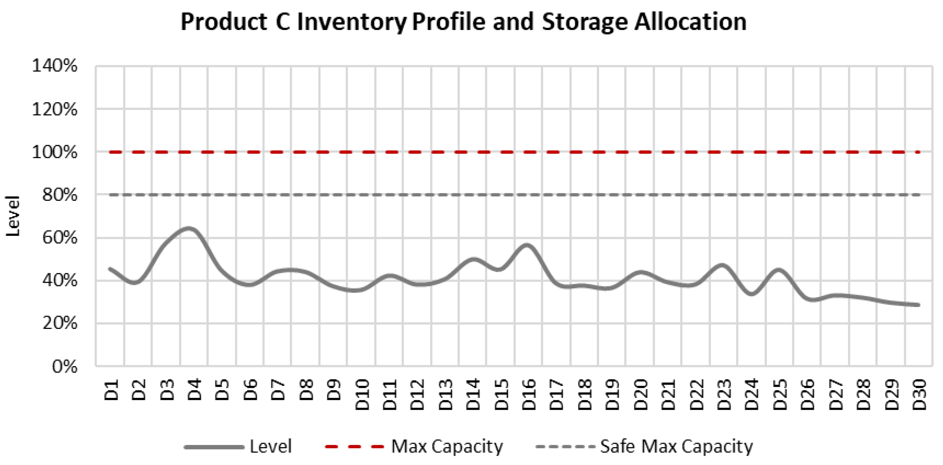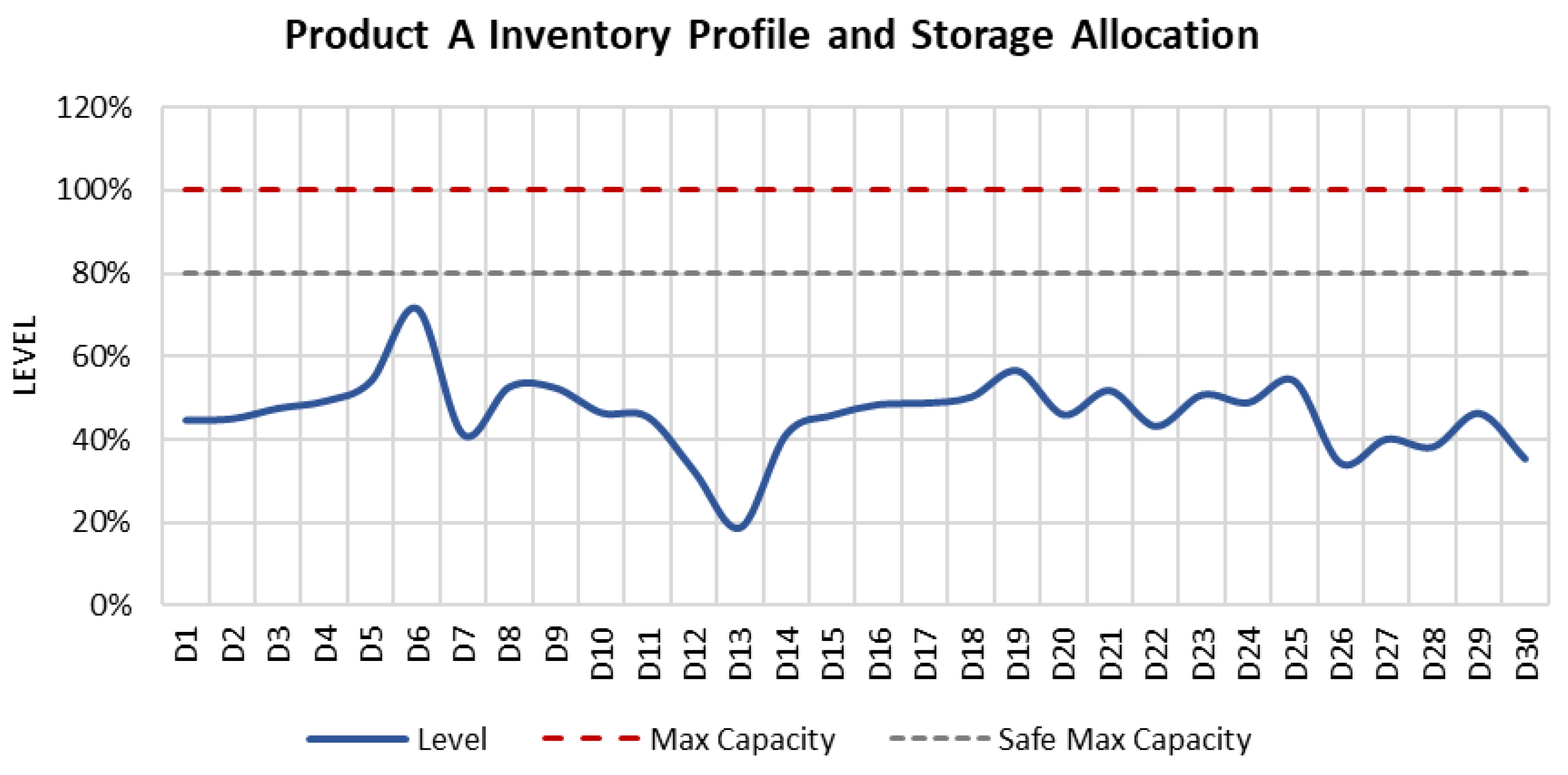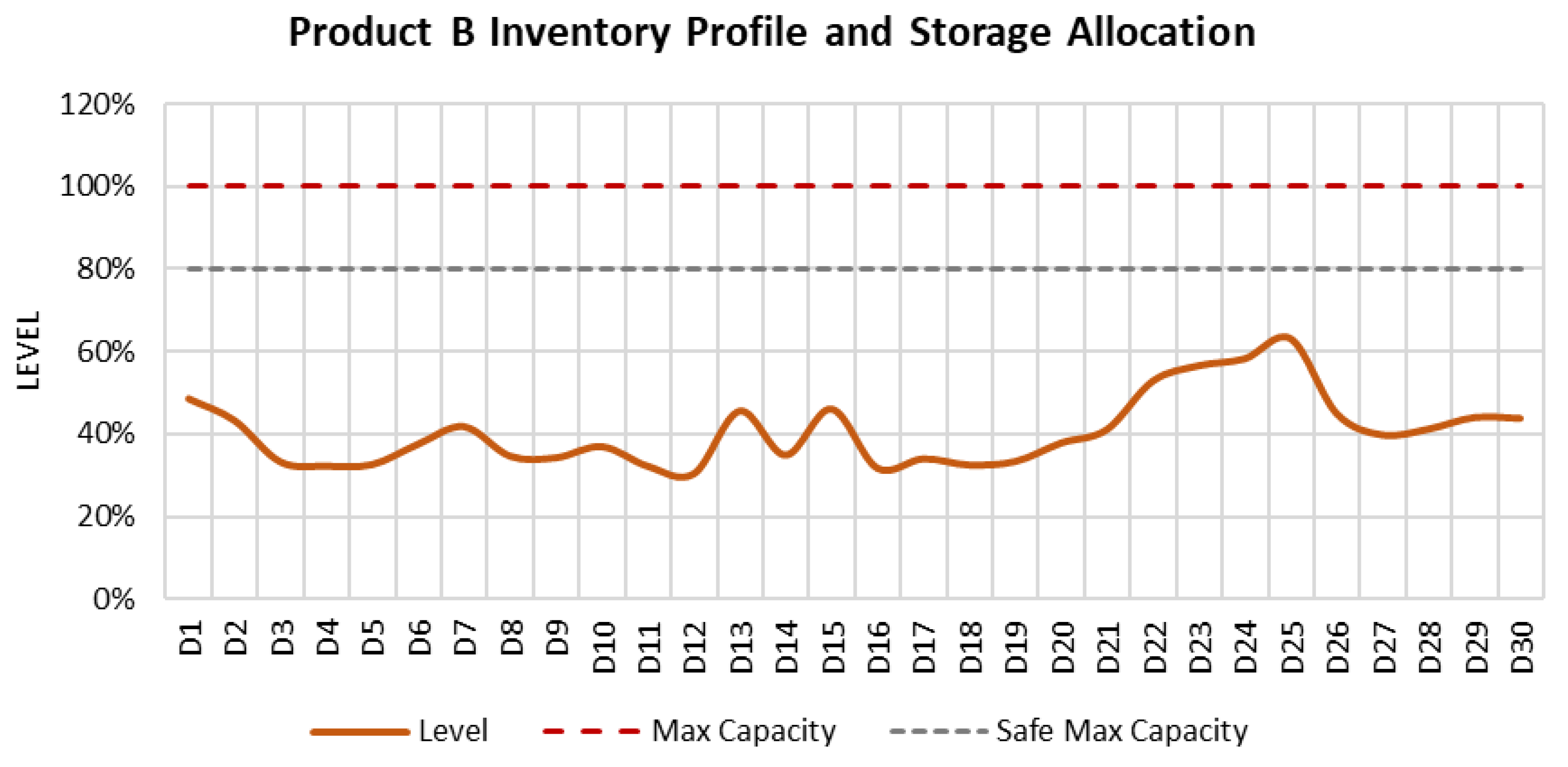 Figure 11 illustrate the inventory profiles that were obtained from the model’s solution. All physical inventory limits are respected, and the model maintains inventory levels below the soft maximum limit of 80% capacity. Additionally, the graphs show how the model was able to maintain the projected inventories without altering tanks’ service, which is one of the objectives to be optimized.